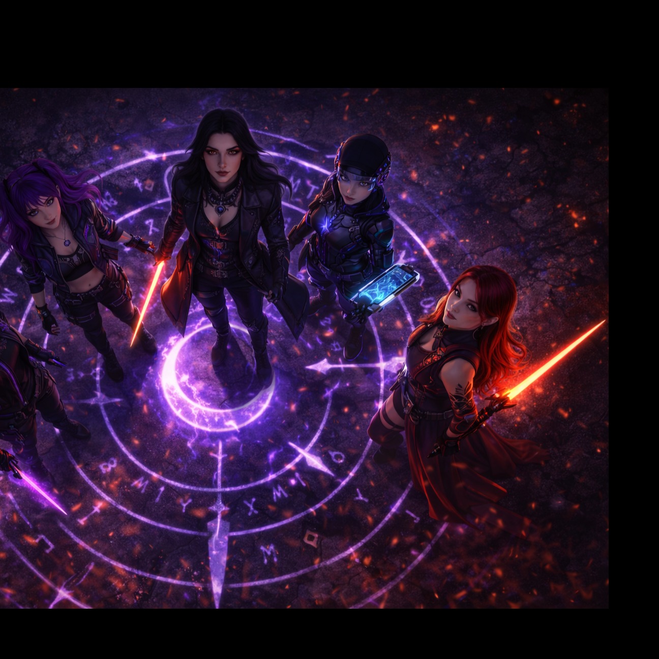 K-pop, female group, dark fantasy, fierce, girl crush concept, heavy bass, powerful synths, dramatic chorus, smooth rap verse, haunting bridge, high energy, polished production, girl group harmonies