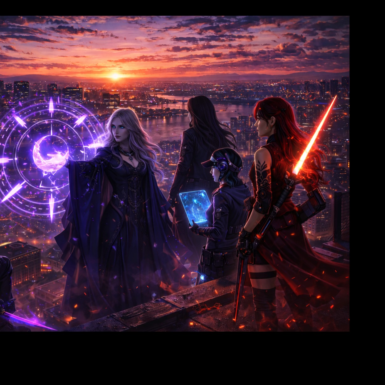 K-pop, female group, dark fantasy, fierce, defiant, girl crush concept, heavy bass, metal-influenced synth riffs, powerful build, dramatic roll call, anthemic chorus, smooth rap verse, ethereal bridge, high energy, polished production, girl group harmonies
