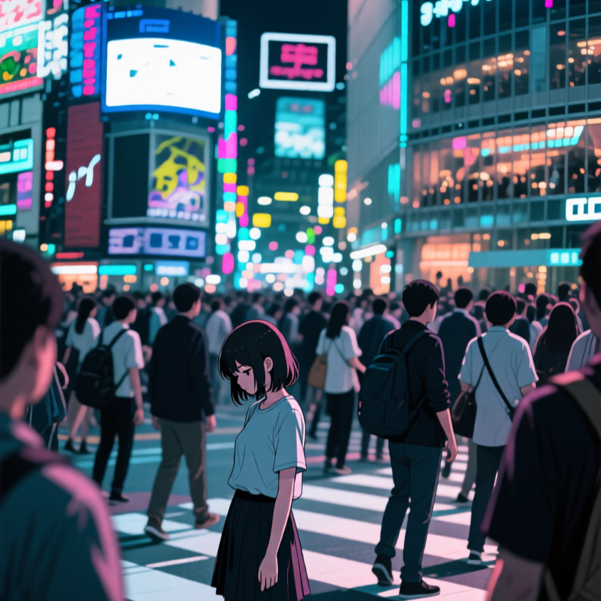 Minor Key, J-pop, Young Female Vocal, Electropop, Synth-pop, Dense Soundscape, Wall of Sound, Dreamy, Atmospheric, Pulsing Synth Bass, Digital Percussion, Ethereal Vocals, Layered Synths, Melancholic, Floating, Crystal Clear Sound, Digital Tears, a dreamy and atmospheric electropop with a clear, floating vocal