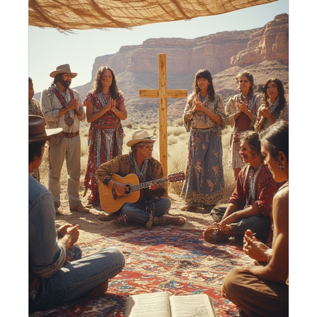 tribal, native american, communal soundscape, percussive with traditional drums, rhythmic, chants, and foot stomps creating a grounded
