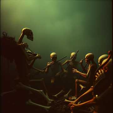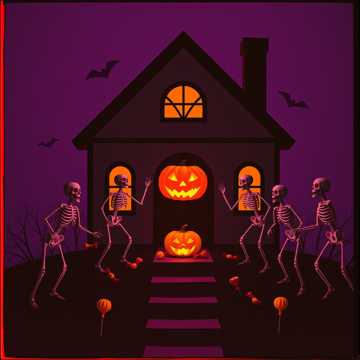 Brutal Halloween slam metal with deep guttural vocals, downtuned chugging guitars, and crushing drums, Add a fun horror vibe — playful but still insanely heavy, Think gory party energy, cartoonish chaos, and groove-laden riffs, Tempo around 95 BPM, lots of stop-start slams and breakdowns, Layer with creepy Halloween sound effects: evil laughs, chainsaws, cackling witches, and children chanting “trick or treat, ” Bass is filthy and distorted; vocals switch between ultra-low growls and exaggerated screams for humor, Overall mood: dark, hilarious, and violent — like a haunted house mosh pit