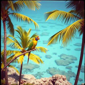 Vibrant steel drums and bright marimba layers provide melodic sparkle; syncopated congas, bongos, and timbales create dynamic Afro-Caribbean percussion rhythms; nylon-string guitar adds smooth rhythmic texture and harmonic depth; lively melodic motifs mimic tropical island birds—such as frigatebirds and pelicans—using flowing flute and pan flute-like phrases that flutter and swoop through the music; light brass accents increase festive energy; ambient sounds of ocean surf, tropical breezes, and seagull-like bird calls create an immersive island environment, Vocals: