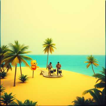 Bright steel drums and marimba accents for tropical color