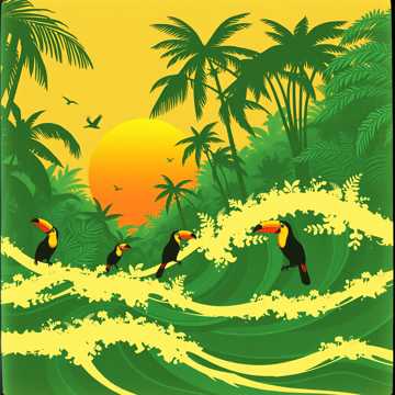 Steel drums and marimba provide bright melodic foundation and sparkle; congas and bongos drive warm, syncopated Afro-Latin rhythms; nylon-string guitar offers soft, rhythmic texture; lively melodic phrases mimic bird calls using flute and pan flute tones, weaving through the arrangement; light brass accents add festive energy; ambient sounds of ocean waves and jungle birds enrich the natural atmosphere, Vocals: