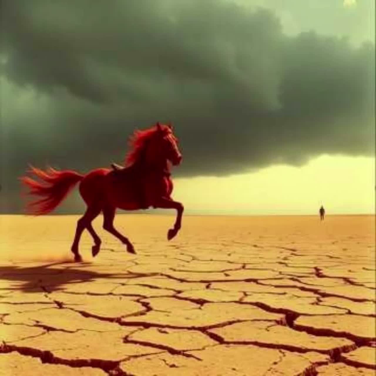 Dark cinematic spoken-word, Radio Apocalypse style, Slow heartbeat bass, low drones, vinyl hiss, subtle static, Calm authoritative narrator with whispered echo, Theme: Red Horse as conflict consciousness, discernment over outrage
