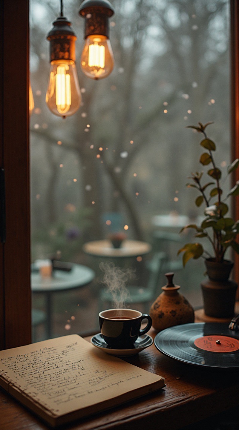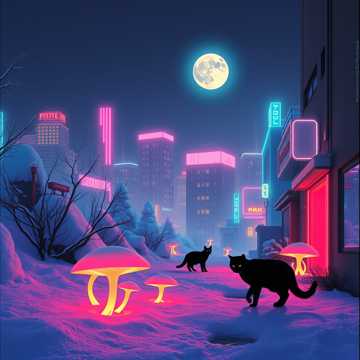 Lo‑fi jazz‑pop with cyberpunk aesthetics, heavy vinyl crackle, and ASMR, Instruments: Rhodes piano (warped by vinyl noise), double bass (bit‑crushed edges), brush drums (with scratch effects), saxophone (distorted, vocoder‑treated), cyberpunk synths (8‑bit arpeggios, metallic pads, data mosh glitches), Female vocal — low, smoky; processed with reverb, tape slow‑down, and light distortion, Tempo: 85 BPM, swinging but hazy groove, Mood: neon‑lit cafe at dawn — rain on the windows, vinyl hiss, circuit noise, distant sirens, Key effects: constant vinyl pops/hiss, data glitches on keywords, ASMR (breathing, paper rustle, cup clinks, snow crunch), Dynamics: verses — minimal, hushed; choruses — synths swell, glitches intensify, Outro — slow data decay, fading neon hum and vinyl crackle