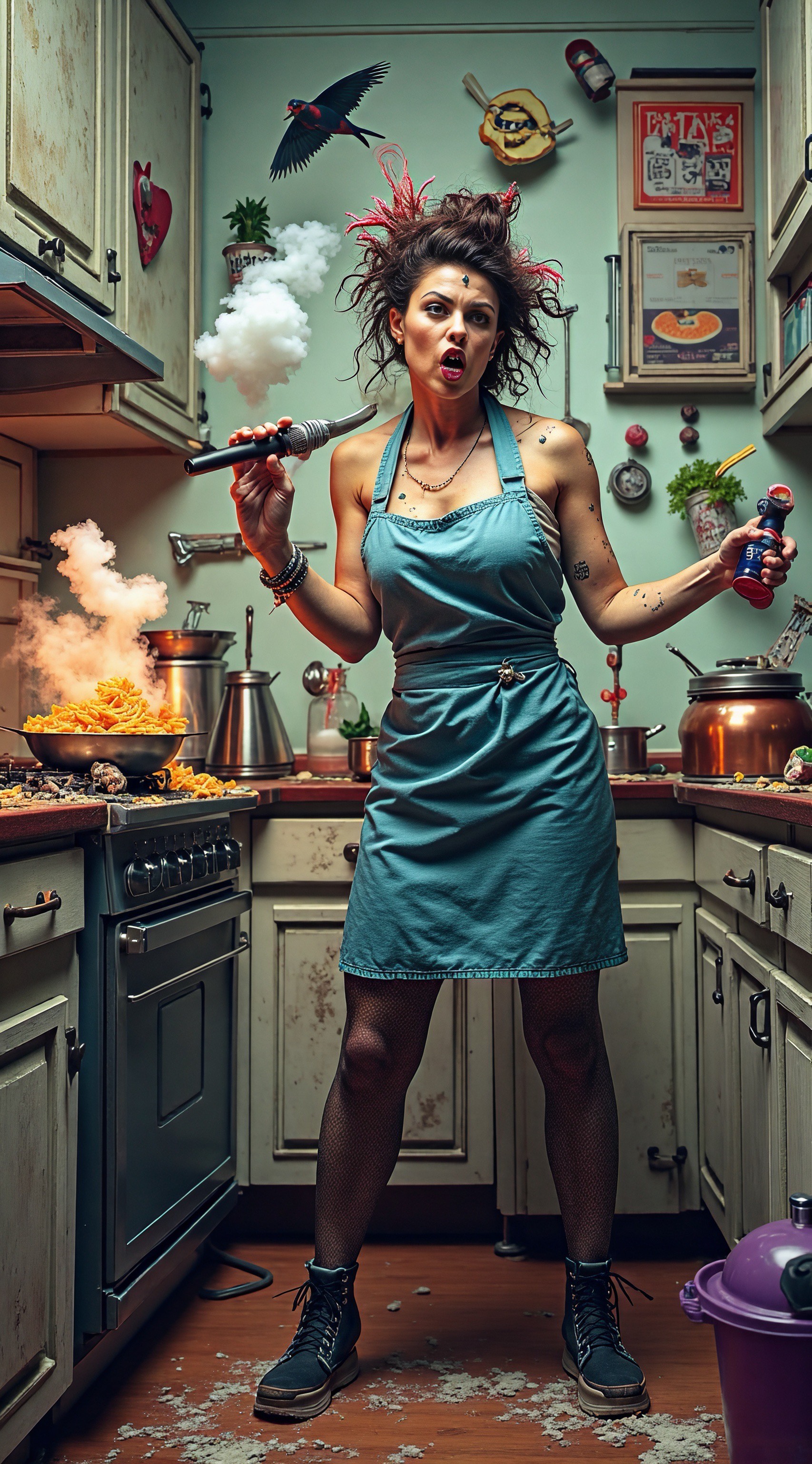 Sharp, defiant, DIY punk meets cafeteria chaos, 140 beats per minute, frantic energy, Female Vocals: shouts with feigned enthusiasm, then a murmur, Instruments: distorted piano, trash can drums, alarm clocks as cymbals, Sound effects: intercom announcements ("No lunch!"), falling trays, Mood: rebellion against the mundane nature of dining—where every line is a middle finger to everyday expectations