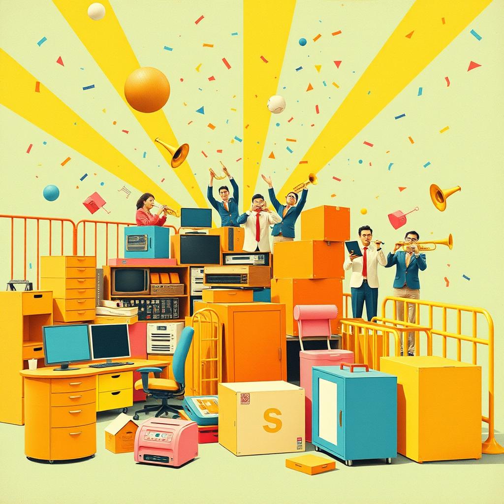 Perform as a chaotic, multi-character office/furniture delivery drama, Distinct voices, interruptions, whispers, exclamations; urgent when busy, slow in tense moments, Backed by a Hip Hop beat using percussive sounds from office equipment — staplers, keyboards, chairs, drawers, printers, fax, scanners, Preserve all text exactly