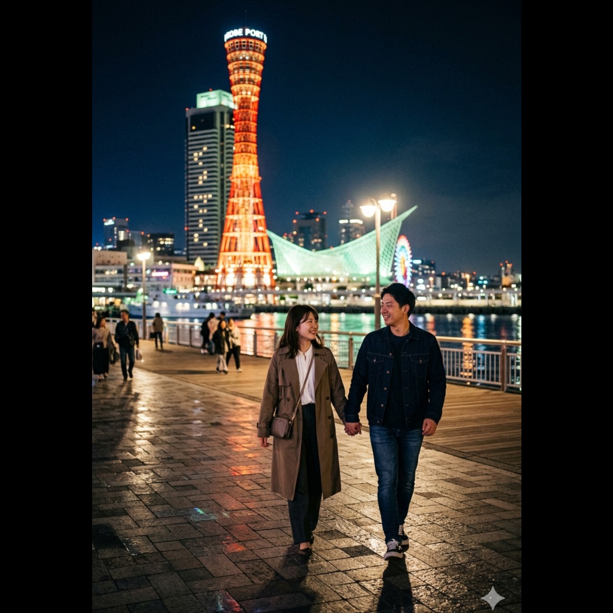 live concert, Hawaiian, city pop, minor, 78BPM, male baritone chorus, live shout chorus, call and response, tenor saxophone(melodic lead), acoustic guitar(fingerpicking), Hawaiian guitar(slide), upright bass(walking bass), drums(brushed), orchestra(string arrangement), A nostalgic night in Kobe harbor, warm breeze and gentle waves, two silhouettes walking the cobblestone streets, love quietly breathing in the glow of the city lights