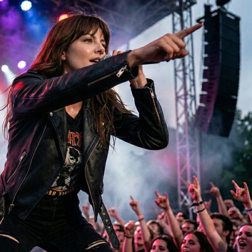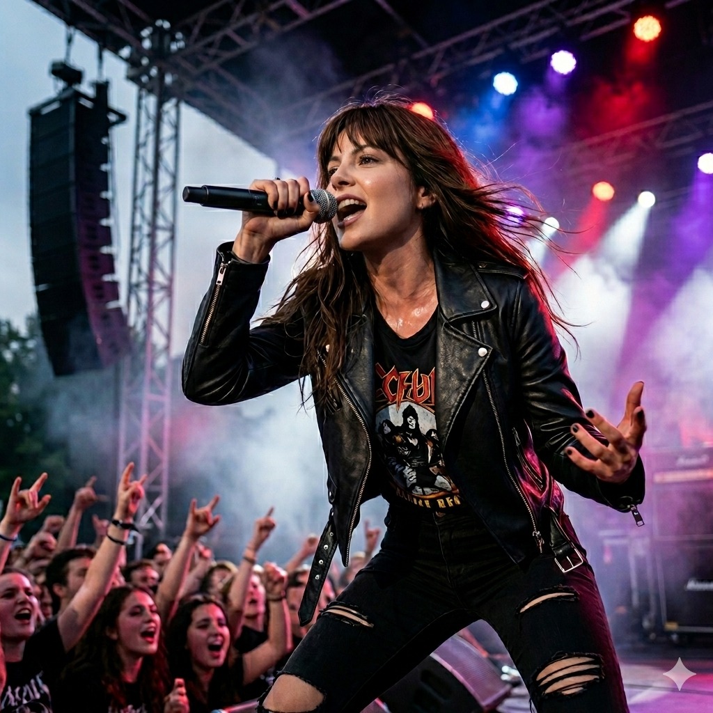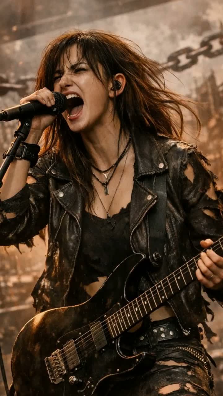 Live concert recording, heavy metal, high-energy, 180BPM, Powerful female lead vocals, confident and authoritative female belt vocals, piercing rock vocals, aggressive grit, stadium reverb, massive crowd noise, call and response, raw energy, dual distorted guitars, fast double-bass drumming, punchy mix, wide stereo imaging, palm-muted chugs, electric atmosphere, arena rock intensity