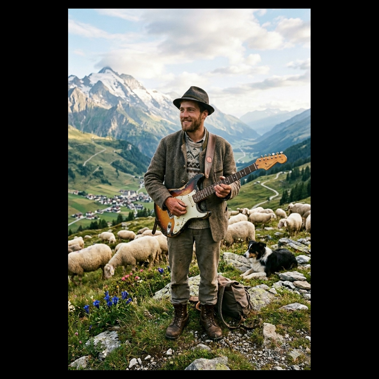 Live concert, psychedelic alpine rock, German yodeling, minor, 136BPM, transparent tenor vocal, live shout chorus, call and response, horn(alpine fanfare bursts), electric guitar(distorted riff), 2nd electric guitar(layered psychedelic tremolo), electric bass(driving root notes), organ(vintage combo organ chords, cheap lo-fi tone), drums(driving rock beat), cowbell(accented offbeat strikes), A shepherd descends from the mountain with an electric guitar to win the heart of a rock-loving girl, blending yodeling and rock in a live minor-key declaration of love