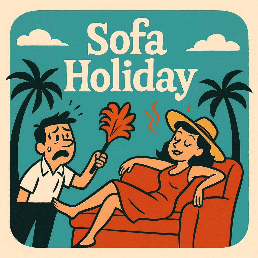 Reggae Pop, Comedy, Lo-fi, Female Vocals, Playful, Laid-back, Domestic, Daydreamy, BPM: 88, Reggae guitar, bass, lo-fi drums, soft keys, Indoor ambience, TV noise, fan hum, distant vacuum, warm cozy mix