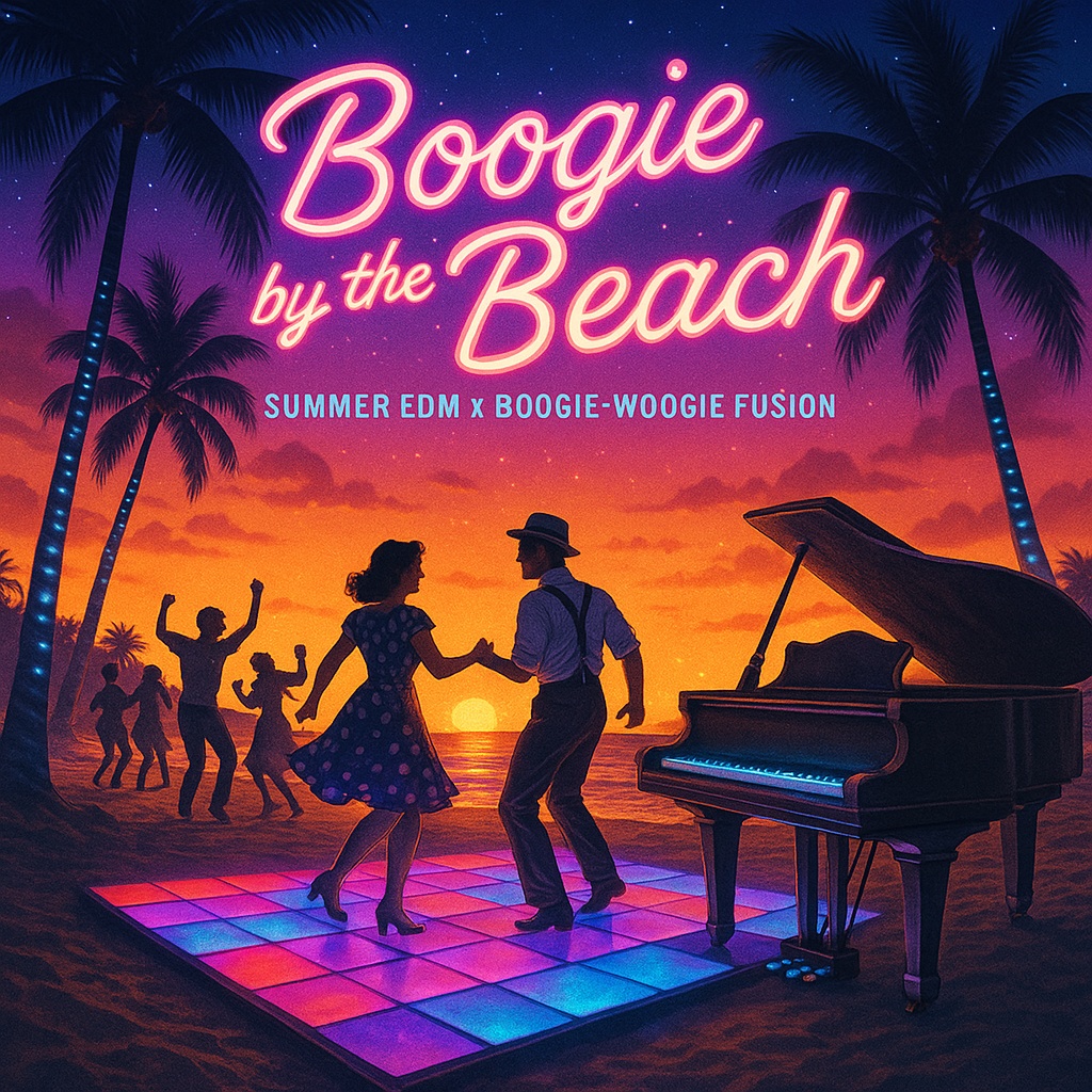 EDM, Boogie-Woogie, Electro Swing, Upbeat, Nostalgic, Summery, Energetic, BPM: 126, Synths, Boogie Piano, Drum Machine, Bassline, Claps, FX, Retro-fused EDM with swing rhythm, beach party vibe, layered vocals
