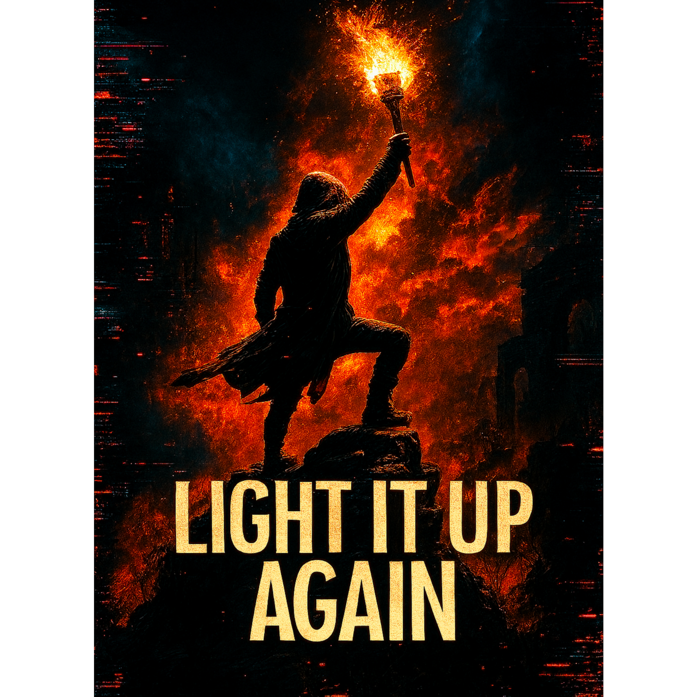 Opening with syncopated, glitchy beats and fragmented folk samples, the verses layer jagged guitars with IDM pulses, Dual vocals—rich clean and vocoder—intertwine, Pre-chorus lifts with spiraling synth arpeggios, Anthemic chorus explodes with harmonized leads over power metal riffing, rebuilt from stuttering folk motifs, Bridge fractures into immersive IDM, ancestral samples echoing through digital chaos, before a climactic, harmonized final chorus restores unity and power