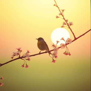[A songbird’s flight through dawn, sky, and dusk — nature’s melody reborn, ]