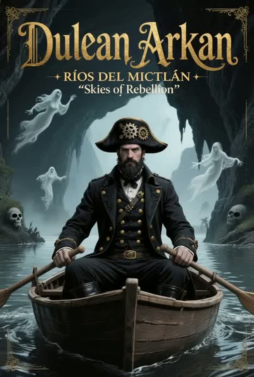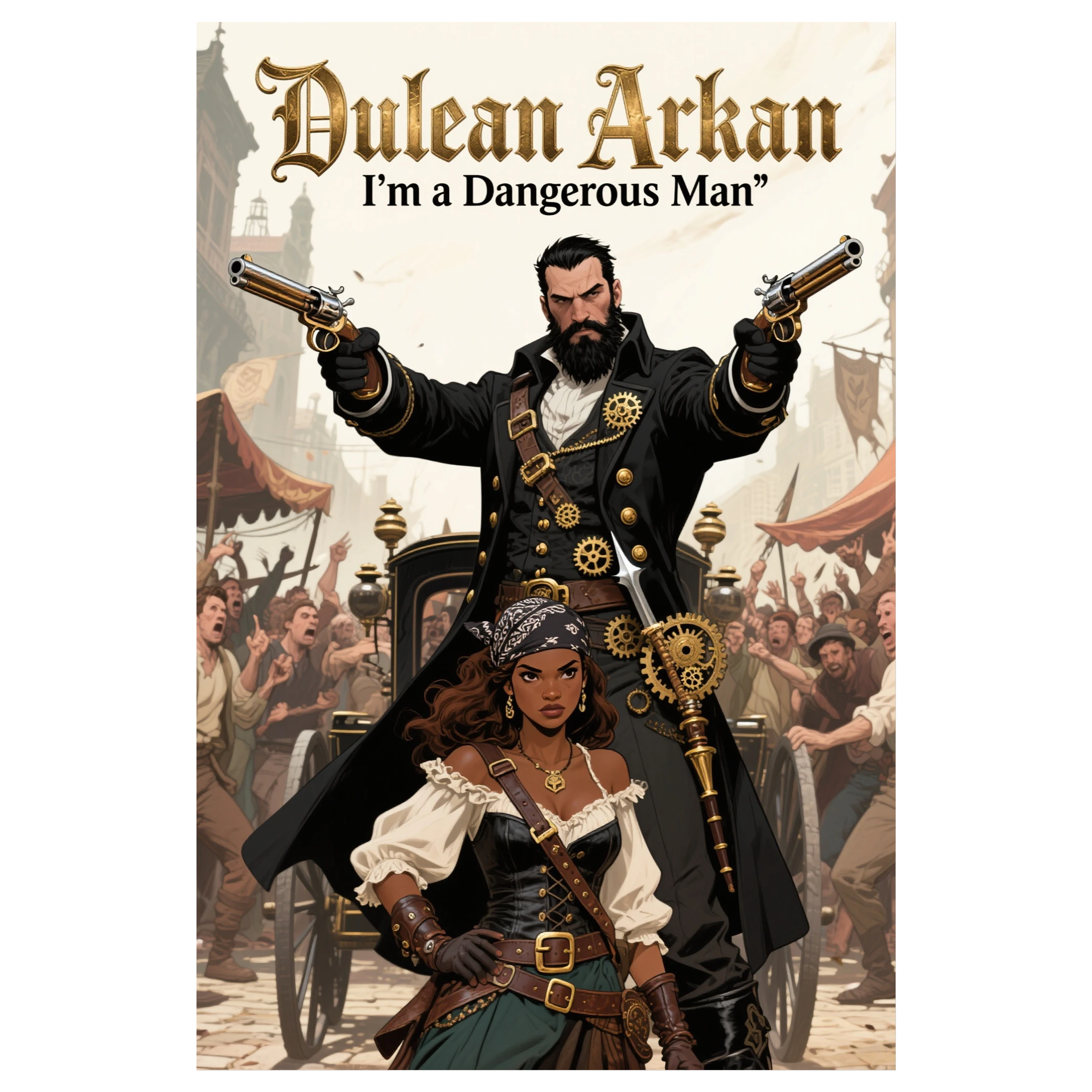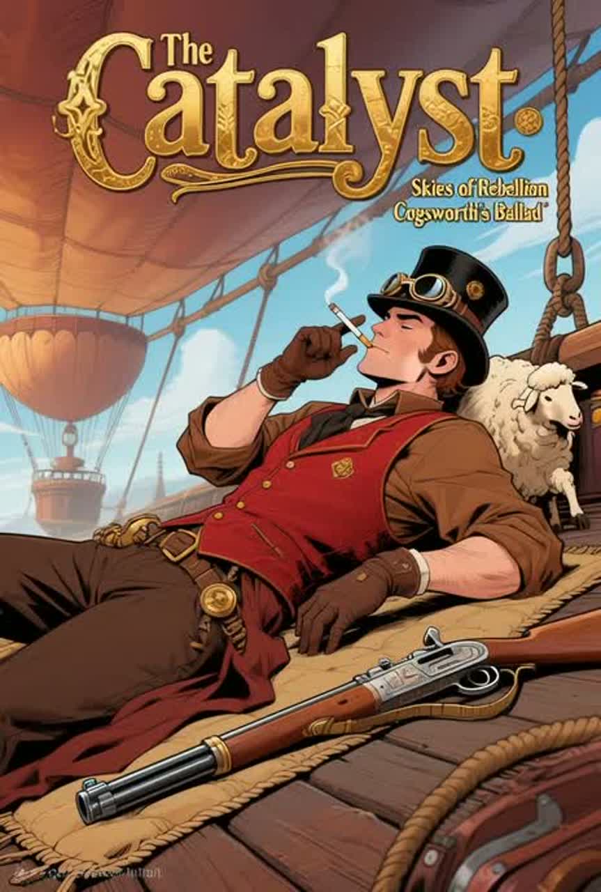 This cinematic rock-metal anthem storms in at 180bpm with war drums, aggressive electric guitar riffs, and thunderous brass fanfares, Hurdy-gurdy and accordion inject a steampunk flair amid clanking gears, steam bursts, and Gothic-industrial textures, Vocals feature a commanding male lead with gang-chant backing, intensifying the adventurous, outlaw spirit, Theatrical swells and electronic layers push the mysterious, rebellious energy