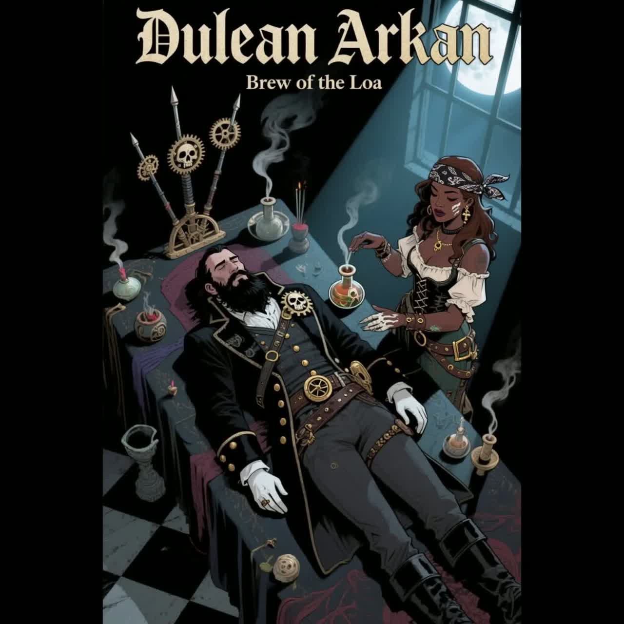 Gothic-Tango / Latin-Waltz mit Blechblรคsern, Harfe, Steampunk-Percussion, Dark steampunk waltz (3/4 time), romantic and melancholic tone, Blend of classical strings, muted brass, soft Latin guitar, piano, and faint mechanical percussion, Vocals: duet male/female, slow and emotional, cinematic atmosphere, Touches of voodoo charm and ballroom elegance