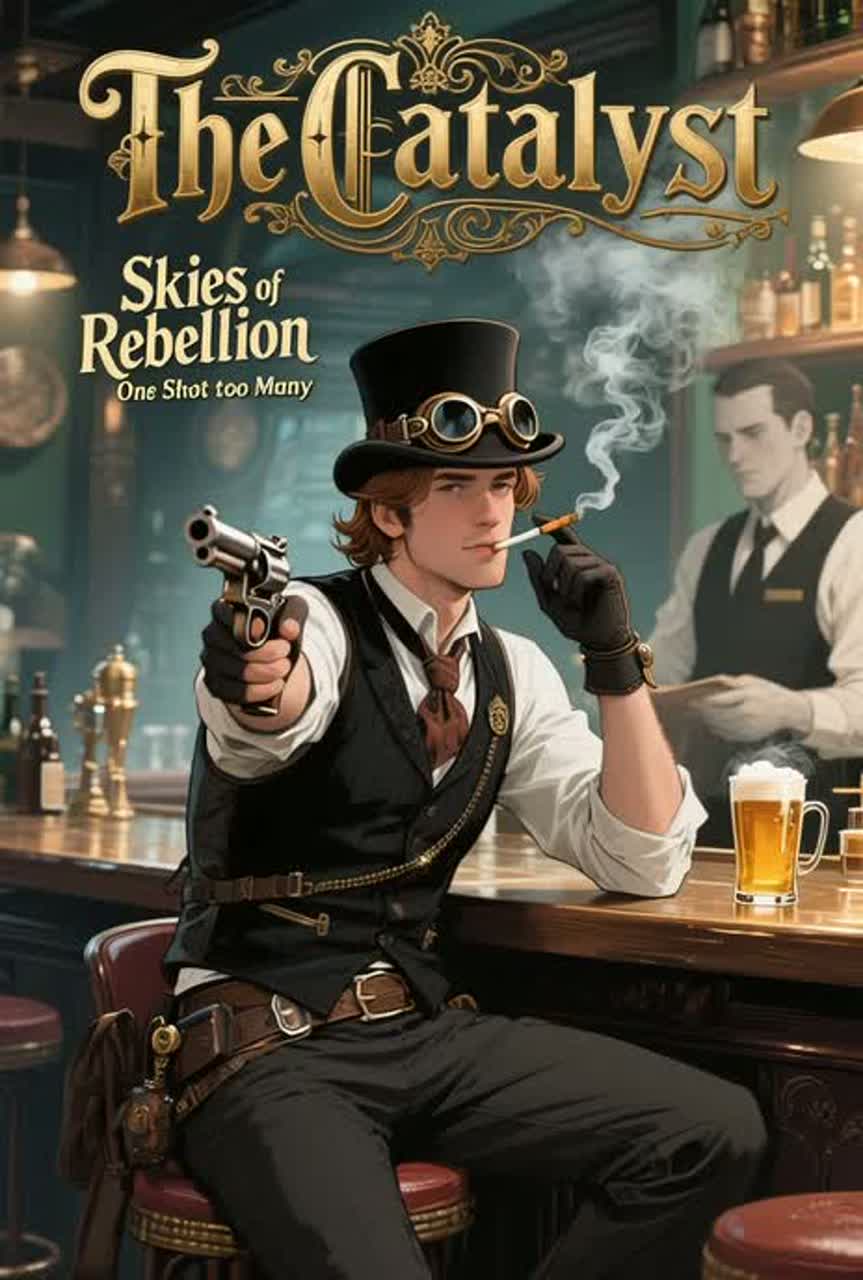 Country-steampunk western fusion, Male vocal, laid-back and gritty, Slide guitar, banjo, deep bass, steam percussion, metallic cymbal hits to represent ricocheting bullets, Scene: Cogsworth sits at the bar during the casinoโs chaos, finishes his beer, and calmly shoots his way through the possessed staff using precise ricochet shots, Tone: relaxed, humorous, heroic, Sounds like an old saloon shootout mixed with industrial elements