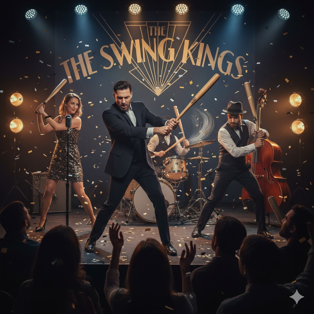 A high-speed swing jazz rock song performed at full throttle, with frantic drums, powerful brass section, walking bass, and electric guitar riffs, Energetic live performance feeling, musicians desperately trying to keep up with the tempo but loving every second, Big band meets hard rock, full of sweat, adrenaline, and syncopation, Dynamic vocal performance with call-and-response shouts like “Yeah!” and “Go!”, expressing passion, madness, and pure rhythm energy, Tempo around 180-200 BPM, bright brass, fast ride cymbal, live concert vibe, audience cheering