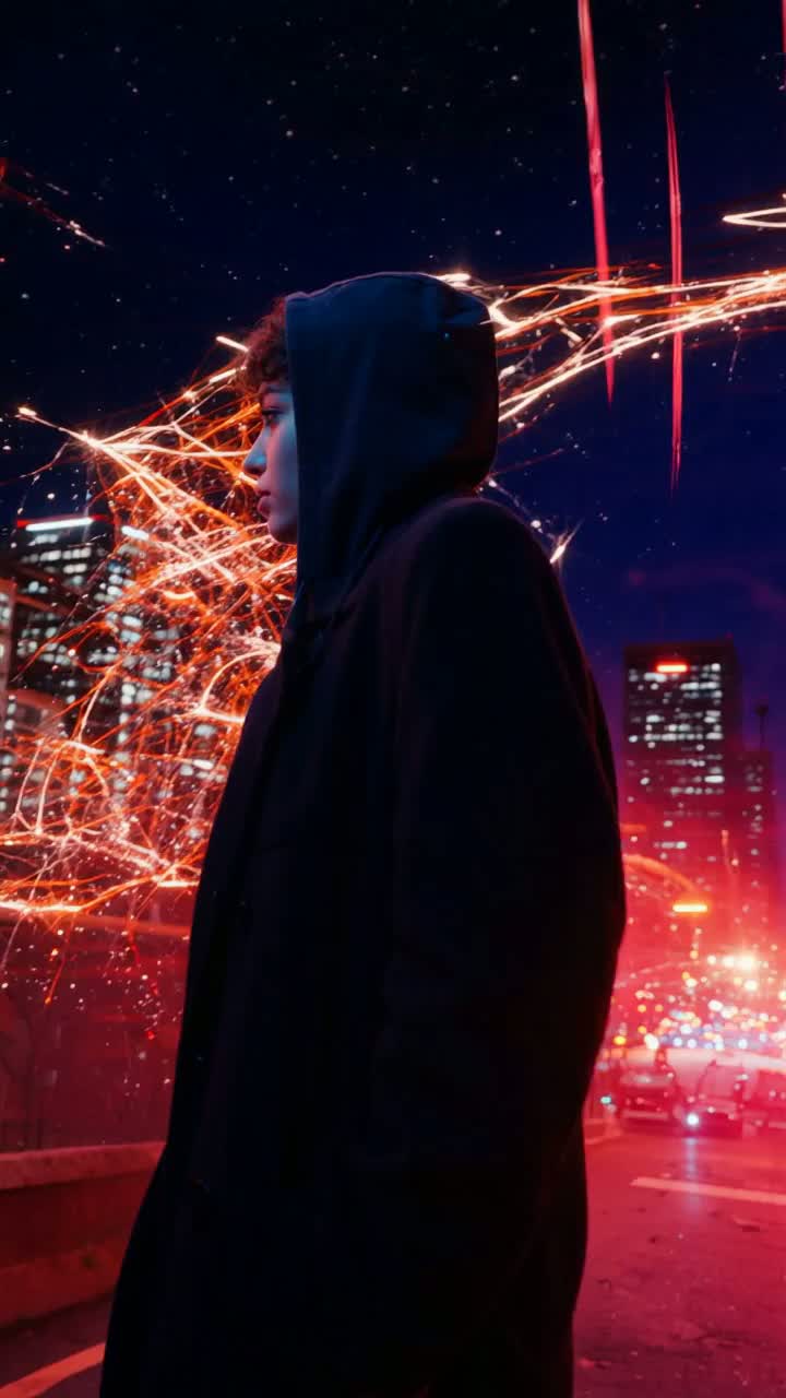 A dark, futuristic synthwave anthem set in a neon-soaked cyberpunk cityscape, Driving four-on-the-floor beats and a pulsating analog bassline propel the track, while soaring retro synth leads intertwine with gritty, industrial textures, Vocals are atmospheric and resolute – at times whispered or processed through a vocoder – enhancing the dystopian feel, The arrangement builds from tense, moody verses into a euphoric, rebellion-tinged chorus, capturing the thrill of outrunning the darkness under flickering neon lights