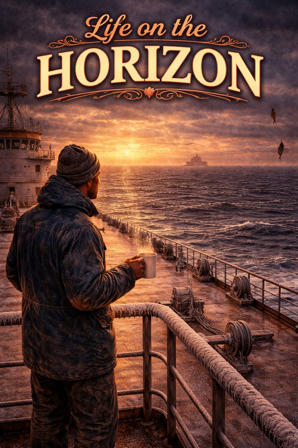 Produce an intimate, cinematic country-freighter ballad called 'Life on the Horizon' with male vocals, Use only acoustic guitar, soft piano arpeggios, and a string quartet (2 violins, viola, cello), No drums, no electric guitar, no synthesizers, Acoustic guitar: fingerpicked or lightly strummed, steady rhythm, Piano: gentle arpeggios, reflective and flowing, Strings: subtle swells in choruses and bridge; violin 1 & 2 for melody, viola for warmth, cello for depth, Vocals: expressive, slightly rough, natural tone, telling the story of lake life, loneliness, and camaraderie, Tempo: moderate and reflective, Mood: rugged, nostalgic, cinematic, intimate, Keep verses sparse, choruses and bridge build dynamics with strings and piano, "*