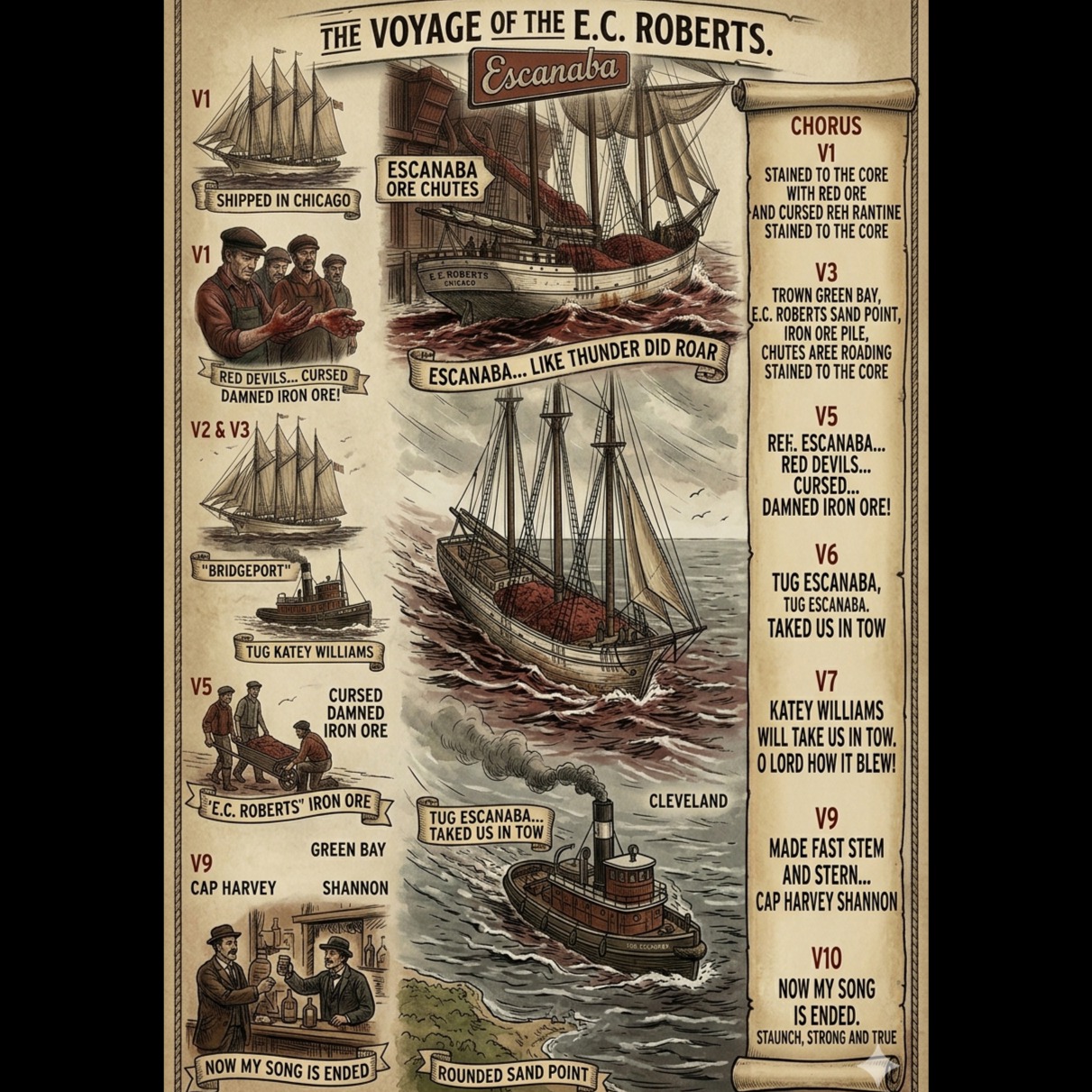 Generate a traditional Great Lakes sailor shanty called “Red Iron Ore”, The performance should be rugged, hearty, and communal, with a steady medium tempo suitable for sailors hauling iron ore on 19th-century lake freighters, Male voices should sing in harmony for the chorus, which repeats after each verse, Include minimal instrumentation like fiddle, concertina, or rhythmic claps/stomps, and evoke the natural sounds of the lake: wind, waves, and creaking wood, The song should tell a detailed narrative of life aboard an iron ore vessel, with vivid imagery of shipping, storms, and camaraderie, culminating in a final celebratory chorus, Ensure each verse is followed by the chorus and finish with a strong, memorable outro