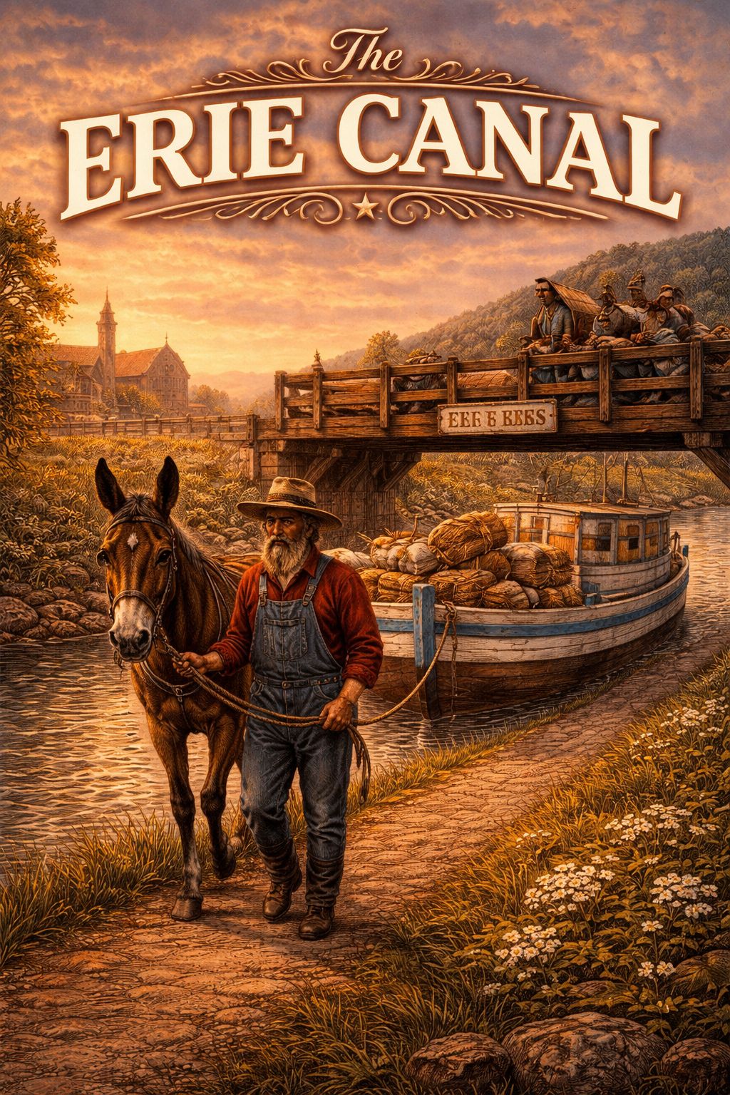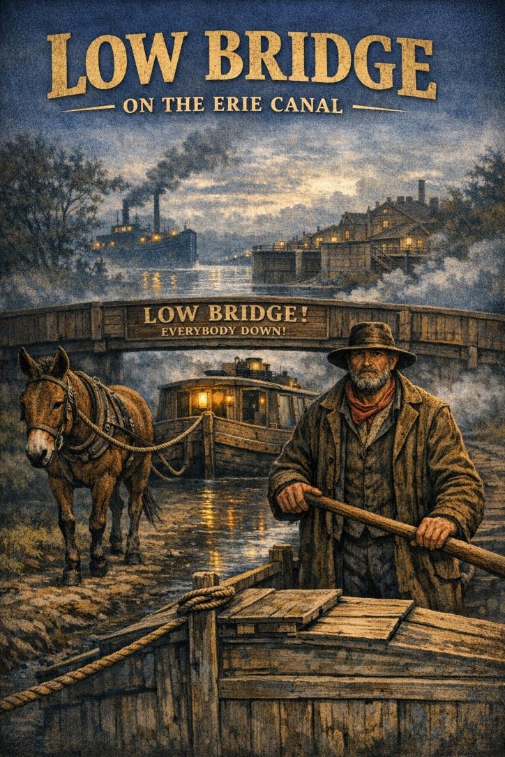 Traditional folk rendition of "Erie Canal" with a warm, mid-tempo acoustic arrangement, Strummed acoustic guitar leads with upright bass, light fiddle, and gentle mandolin picking, Male vocal is relaxed and storytelling, slightly weathered but friendly, Gentle swing rhythm like a canal work song, Clean, organic production, no harmonica, minimal percussion, classic Americana folk atmosphere, natural room sound