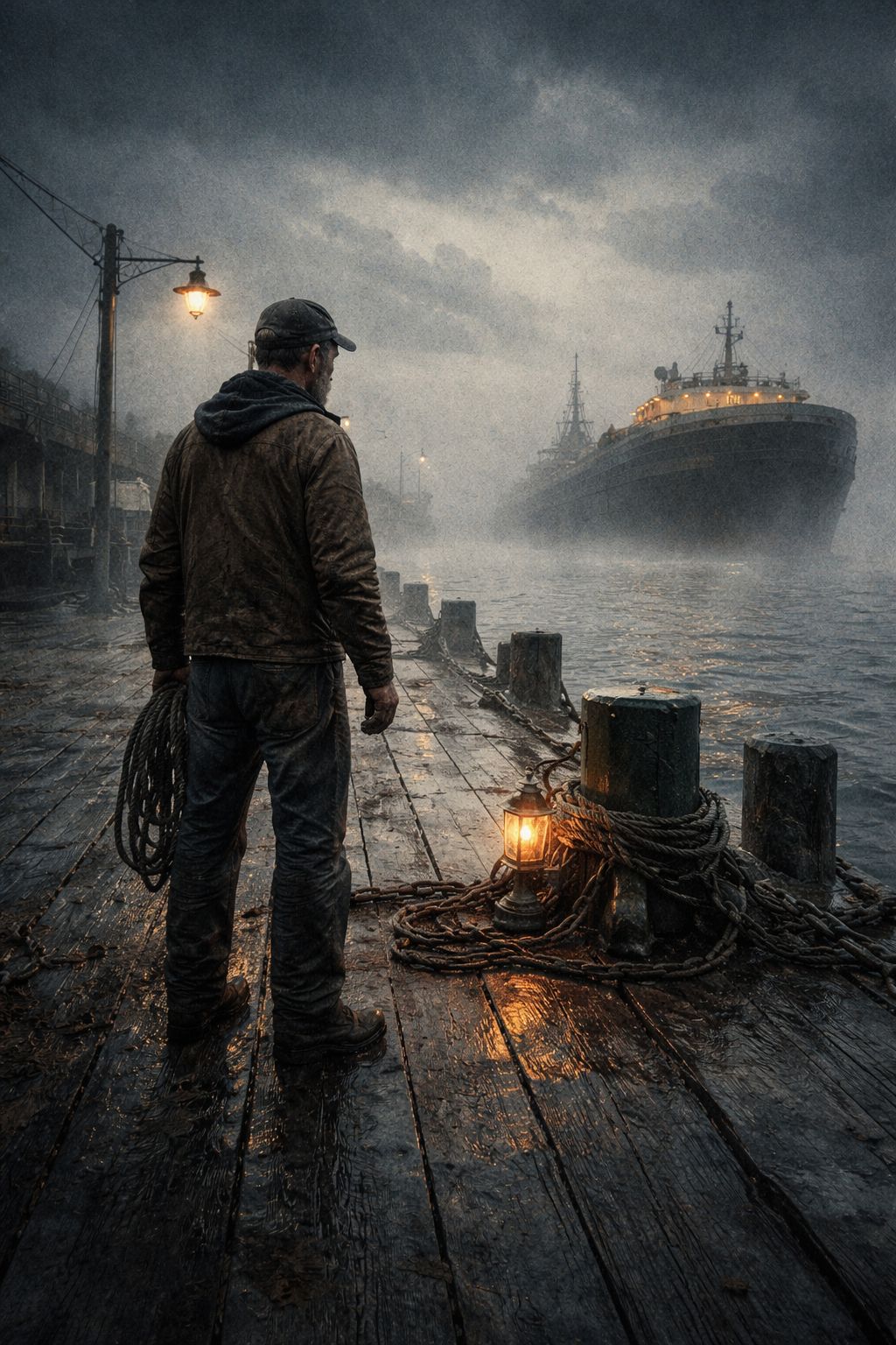 “Haunting, grounded acoustic country song, dark and somber, Instruments: fingerpicked acoustic guitar with dark tone, sparse pedal steel, low cello, minimal fiddle, light brush percussion, Vocals: rough, low male voice, tired and weathered, restrained emotion, not polished, Mood: overcast Great Lakes dock at dawn, heavy fog, cold gray air, no sunlight, damp and oppressive, Ambient: distant freighter horn, diesel hum, water lapping, no bright or warm elements, Mix: dark, low, moody, reduced brightness, stronger low end, intimate and raw, Lyrics: Dockyard Psalm, emphasize Alpena, Green Bay, pierhead light, dockyard mist, Chorus: “In the dockyard mist I sing slow, ”