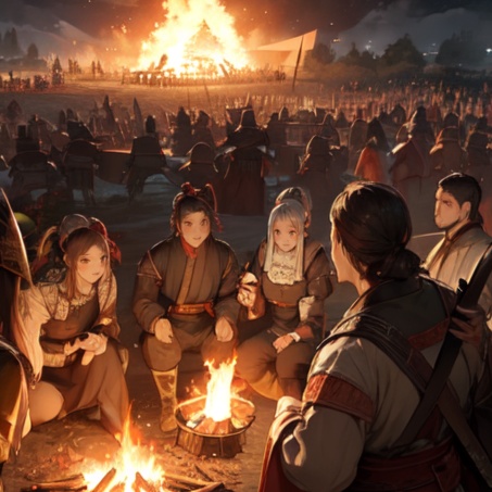 Effects: A soft, ambient reverb to give a sense of space, The instruments should feel crisp and clear, as if they are playing in a grand concert hall, Scene Imagery: A sunrise on a crisp morning, A grand, open field where friends gather, Sunlight glinting off of instruments, Language: Japanese (日本語)
