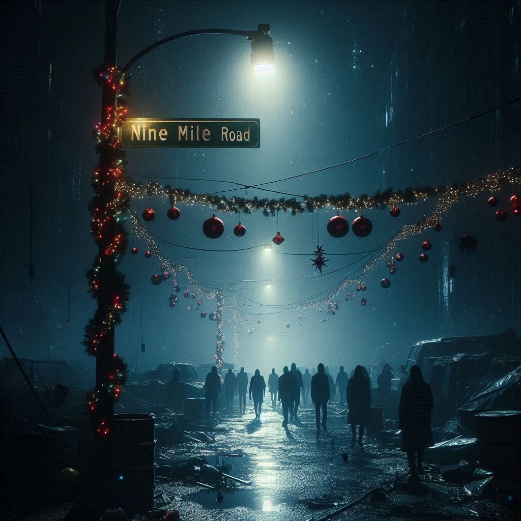 gospel choir 1950 big band classic christmas ballad, very slow melody, male vocals, gunfire, police sirens, orchestra, bucket drumming, funk bass, electric guitar, saxophone
