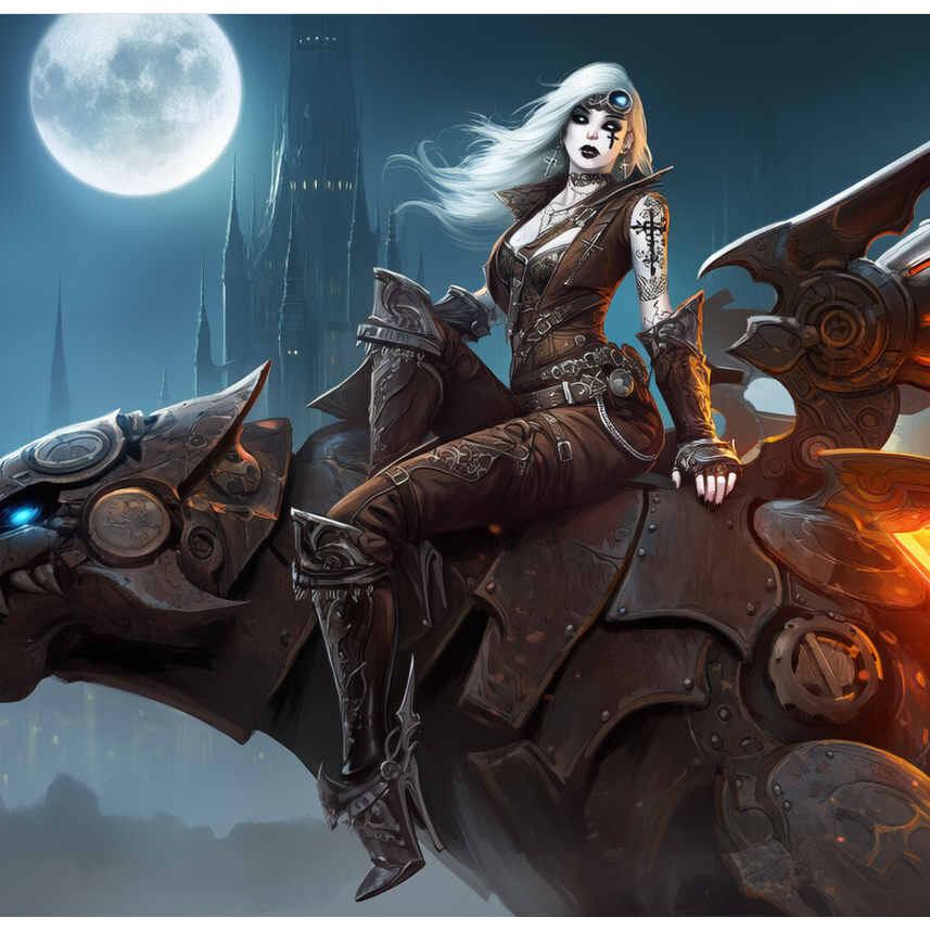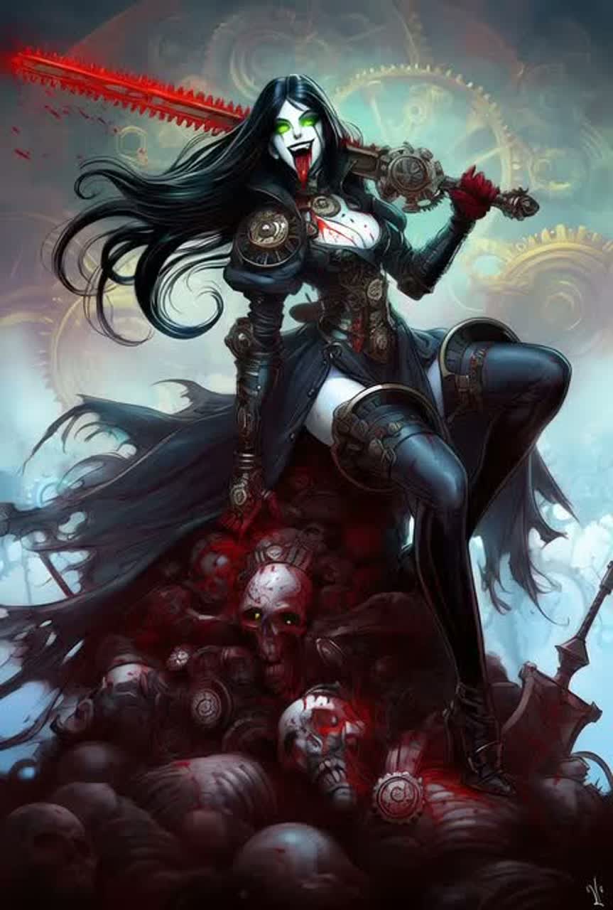 Steampunk gothic metal with thunderous mechanical percussion and heavy, gear-and-piston rhythmic elements, Drums should sound like industrial machinery — hydraulic impacts, clanking metal, boiler pressure rhythms, Guitars are dark, powerful, and dramatic with slow, heavy gothic chord progressions, Add atmospheric pipe organ or choir pads to create a grand, cathedral-like war anthem feeling, Vocals are female, confident, commanding, and predatory — sometimes smooth and regal, sometimes sharp and forceful, expressing dominance and dark triumph, The overall sound should feel like a massive mechanical war machine marching through a burning city: majestic, brutal, and unstoppable