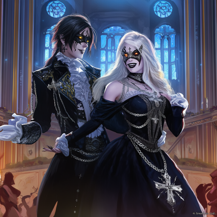 A duet with a dark romantic tone, Gothic rock atmosphere with soft dream pop haze and a deep darkwave pulse, Slow ethereal vocals drifting between intimate whispers and elegant dramatic swells, Piano leads the melody with echoing minor chords and delicate, haunting arpeggios, Violins rise and fall like a waltz, adding emotional tension and sweeping melancholy, The percussion is subtle and steady, with a heartbeat-like kick and gentle cymbal swells, The male voice is velvet-smooth and low, controlled and longing, The female voice is airy and luminous, graceful with a haunted sweetness, Their harmonies intertwine like two lovers circling each other in a moonlit ballroom, warm and cold at once, The mood is elegant, gothic, romantic, and bittersweet