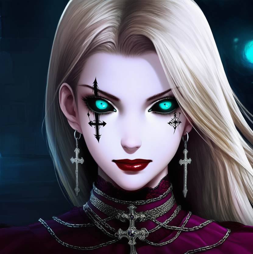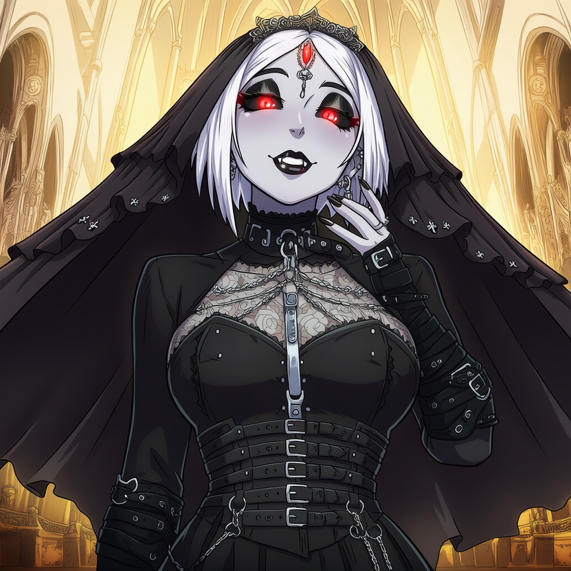 Gothic doom metal with a slow, heavy, and ritualistic atmosphere, Guitars should be deep, sustained, and grim, with dark, echoing reverb that feels like sound resonating inside a cathedral, Drums are slow and powerful, like ceremonial procession beats, Organ or choir pads create a sacred, haunted chapel ambiance, Vocals are female, solemn and commanding, shifting between cold, chant-like phrases and intense, blood-tinged growls or rasped lines, The tone should feel reverent and predatory at the same time, like a sacred ritual carried out in secrecy, No rushing, no brightness — everything is deliberate, heavy, and devotional, with an undercurrent of hunger and divine corruption