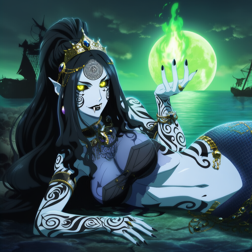 Gothic sea shanty with dark folk and metal influences, Fiddle is a lead melodic instrument, playing haunting, winding lines that feel like waves pulling a ship under, Pan flute provides eerie, drifting accents like distant calls over open water, The rhythm should sway like the tide—slow, heavy drums with a rolling, waltz-like pulse, Guitars are deep and atmospheric, adding weight and shadow without overpowering the folk elements, Vocals are female, hypnotic, and predatory: smooth, alluring, and slightly dangerous, with occasional powerful, emotional bursts, The tone is oceanic, ancient, and mournful, but also intimate and hungry—like a siren inviting a sailor to drown willingly, Focus on atmosphere, sway, and dark beauty