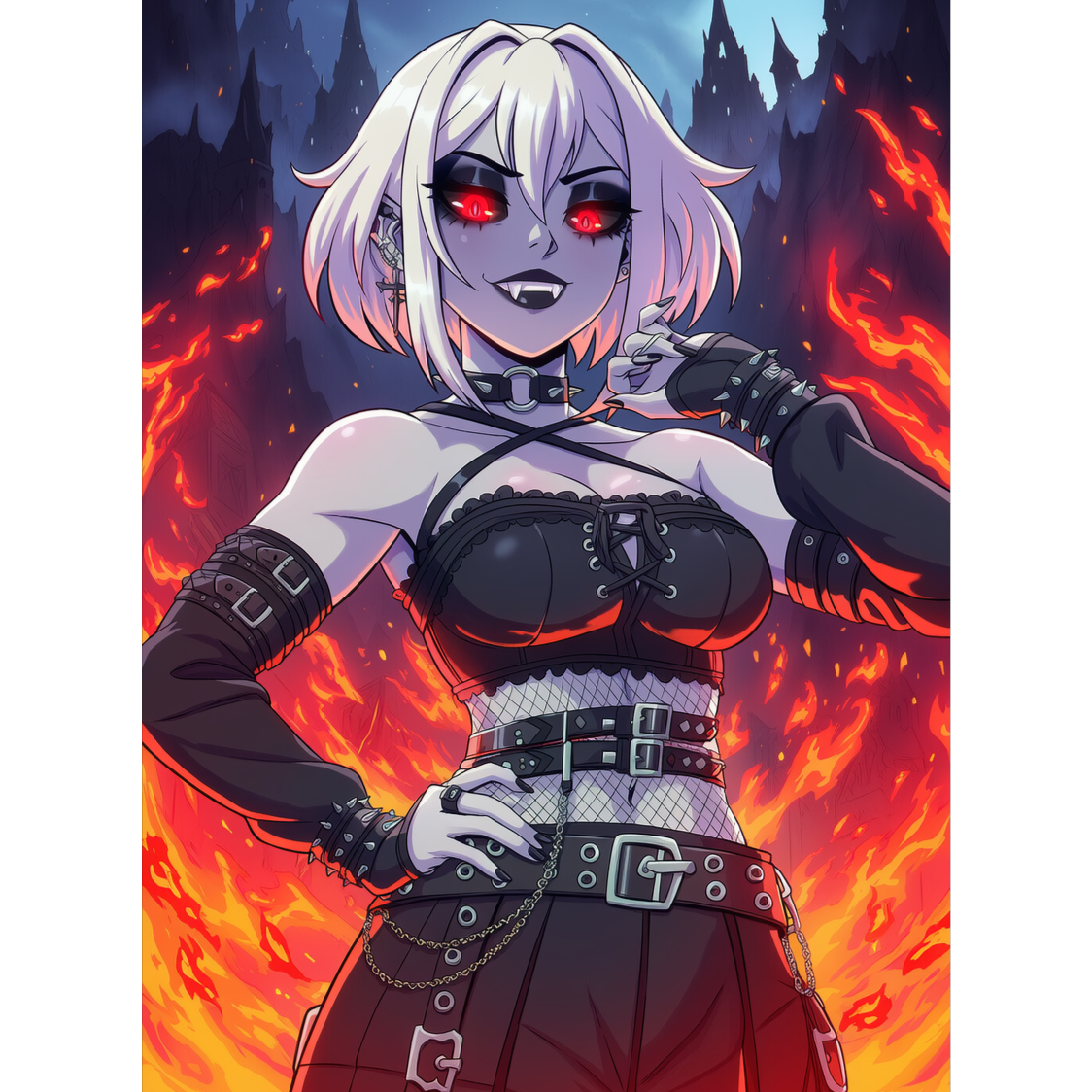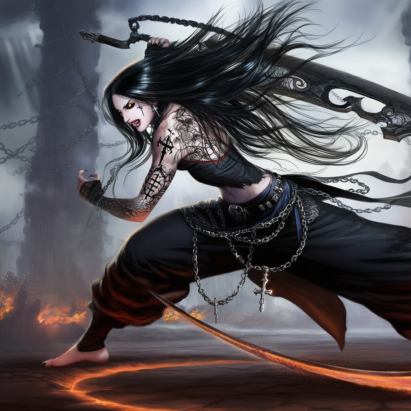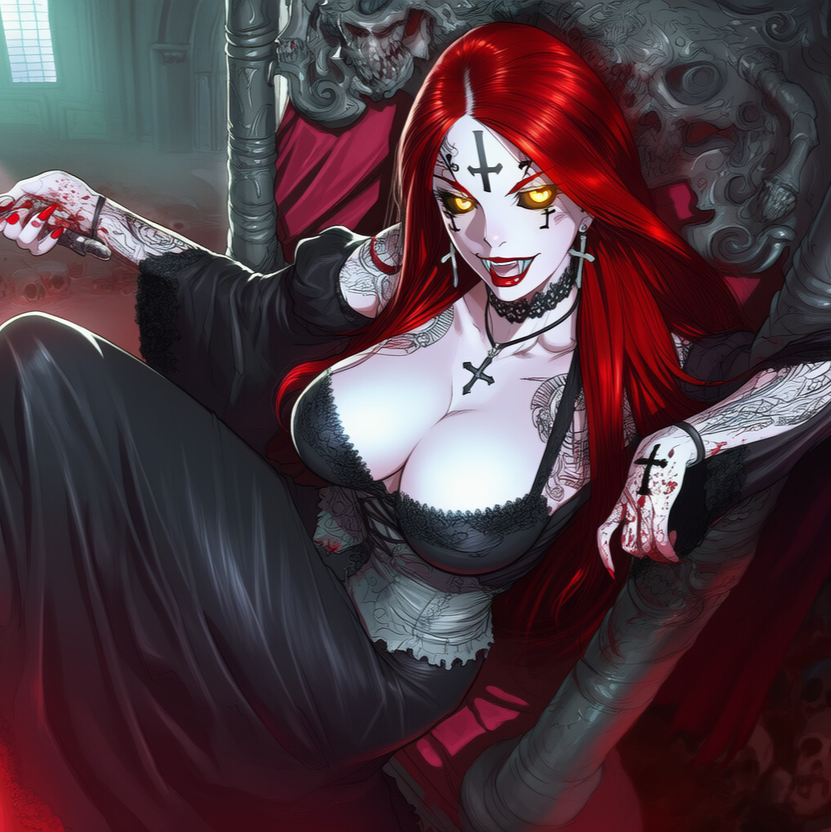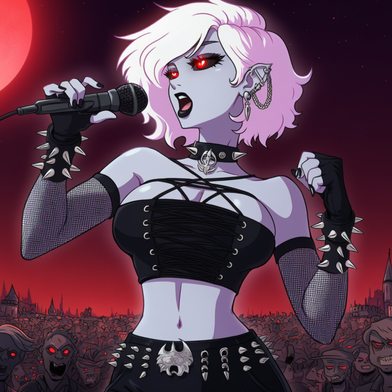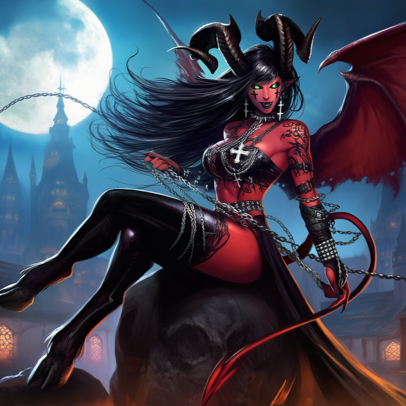 A blazing fusion of Groove Metal, Shock Rock, Gothic Rock, and EDM, driven by a female demon vocalist blending seductive power with growling fury, The track grooves with syncopated riffs, pulsing basslines, and heavy electronic percussion, layered over distorted guitars and dark club synths, Metallic crashes and rhythmic industrial beats build a seductive yet punishing tempo that invites both movement and surrender, Gothic choirs and church-bell echoes intertwine with electronic drops and vampiric whispers, creating a sound that’s both ritual and rave, The atmosphere pulses like an infernal nightclub—dangerous, sensual, and ecstatic, with every beat dripping in sin and swagger