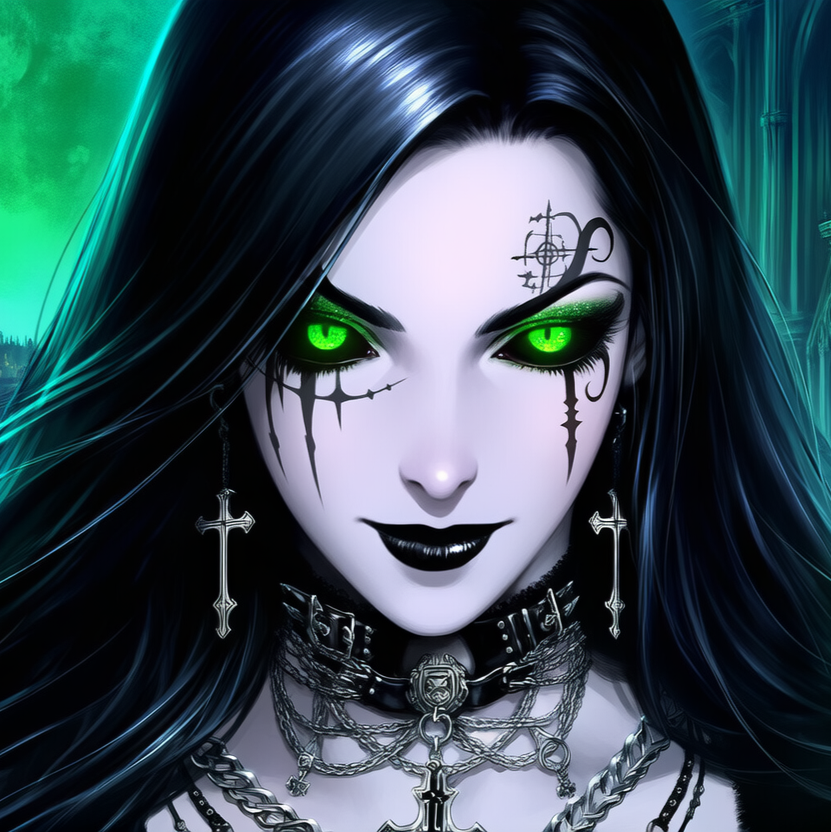 A dark, seductive blend of glam metal attitude, gothic pop melody, and doom metal heaviness, The guitars should be thick, slow, and heavy, with sustained chords and dramatic bends, Bass is deep and warm, carrying a slow, marching pulse, Drums are powerful and deliberate, favoring big tom rolls and ringing snare hits, giving the sense of ritual or theater, Vocals are femme-dominant, confident, smooth, and a little dangerous — half-whispered seduction that blooms into soaring, emotional lines, The melody should feel hypnotic and glamorous, with moments of bright shimmer layered over dark, heavy atmosphere, The overall mood is dramatic, elegant, and slightly decadent, as if the performance is happening under velvet stage lights in a cathedral turned nightclub