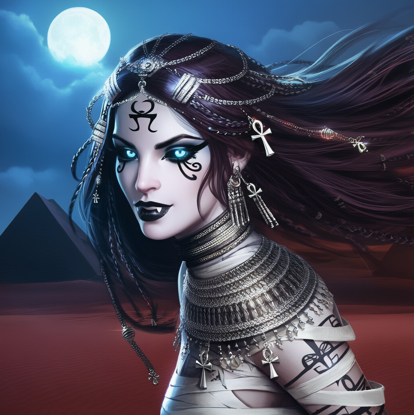 A dark, cinematic blend of gothic metal and doom metal with strong Middle Eastern desert atmosphere, The core melodic instrument is the Oud, playing slow, hypnotic motifs and mournful bends, Layer this with heavy, low-tuned guitars that move in slow, deliberate chords rather than fast riffs, Drums should be deep and echoing, like footsteps across vast sand, with tom-driven rhythms and minimal cymbals, Bass is warm, rumbling, and sustained, Add subtle choir or low chanting to give the sense of ancient ritual, Vocals should be female lead, calm, commanding, and regal, shifting from soft near-whispers to powerful sustained notes, The overall tone is eternal, solemn, beautiful, and heavy, like a queen who has ruled the desert for centuries and does not need to raise her voice to be obeyed