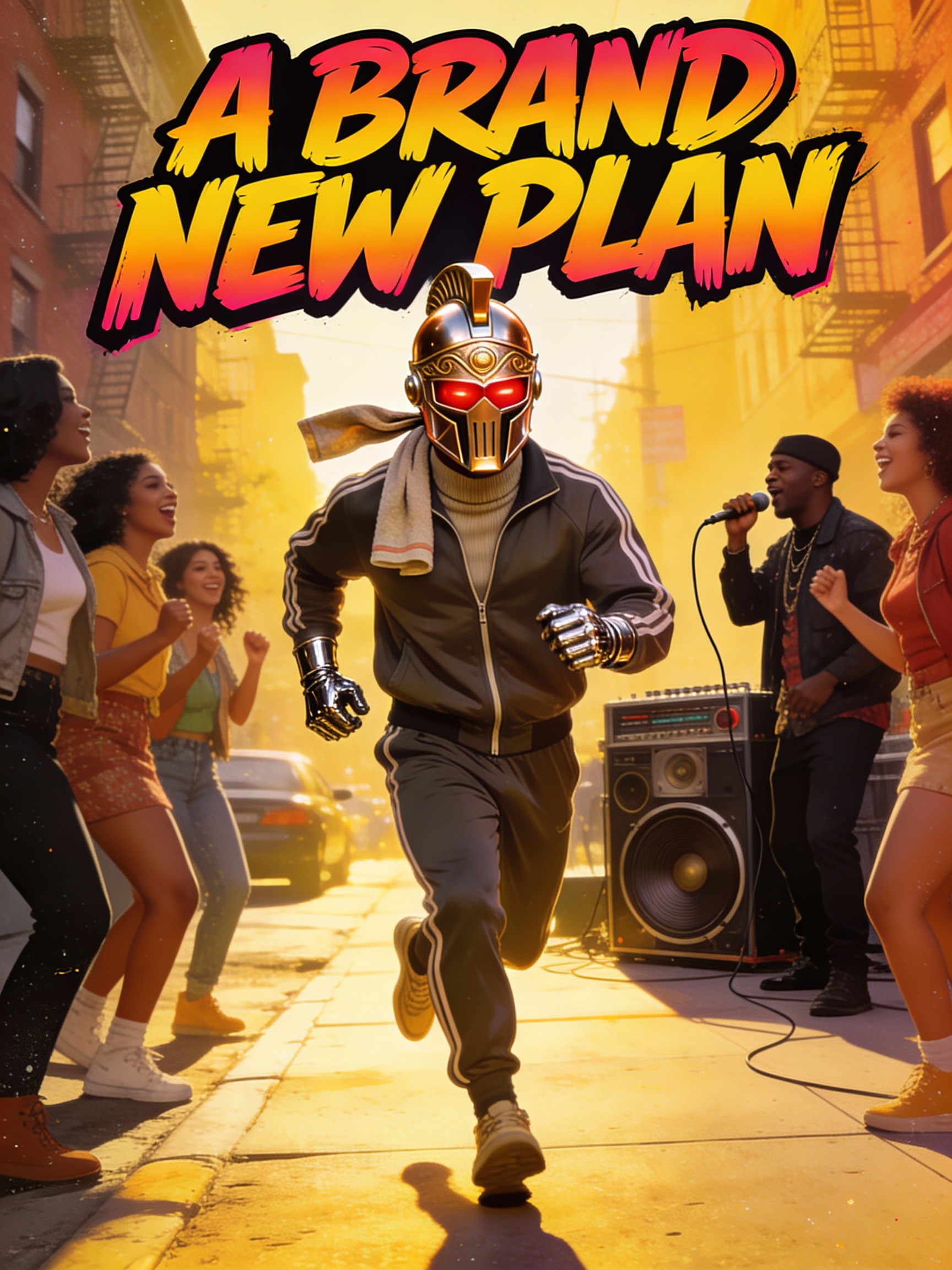 Early 1980s hip hop, old school rap, breakbeat foundation, 110 BPM, boom bap drums, punchy kick and snare, funky bass guitar with slap technique, DJ turntable scratches, record cuts and breaks, male rapper with clear narrative flow, conversational delivery, call-and-response vocals, group chant backgrounds, block party energy, upbeat motivational vibe, vinyl crackle texture, analog warmth, handclaps and percussion breaks, scratched vocal samples, uplifting positive message, street party atmosphere, golden age hip hop aesthetic, raw authentic sound, celebratory rap energy