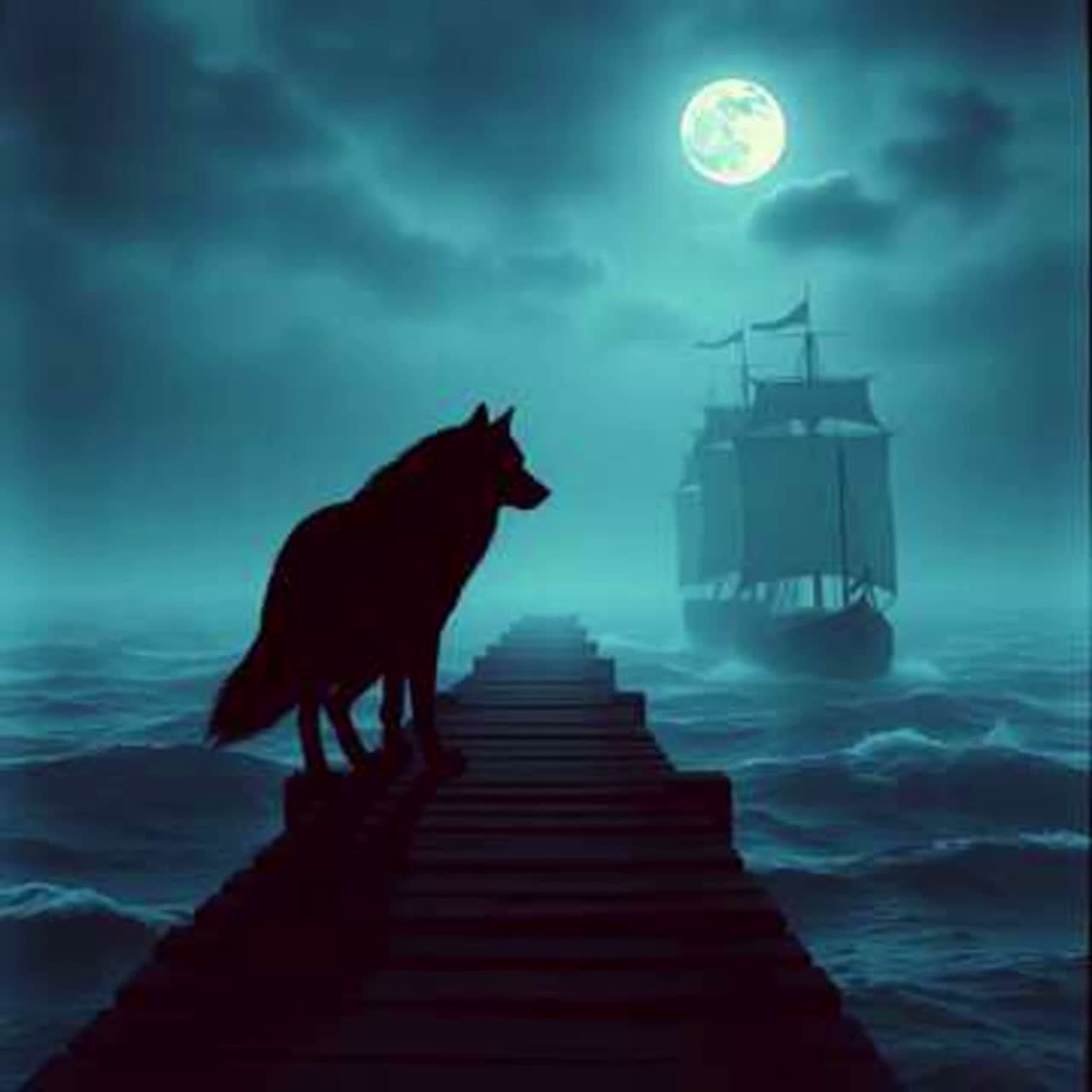 High-energy stomping sea shanty / folk rock pirate song, ~100–105 BPM, Heavy boot stomps, bodhrán, floor toms, acoustic guitars, aggressive fiddle riffs, Loud gravelly male lead vocal with massive crew chants and call-and-response, Minimal melody focus, rhythm-driven, chant-heavy, tavern and festival-ready, Epic pirate storytelling about the Wolf of the Harbor battling the cursed Moonless Fleet, Raw, powerful, anthemic
