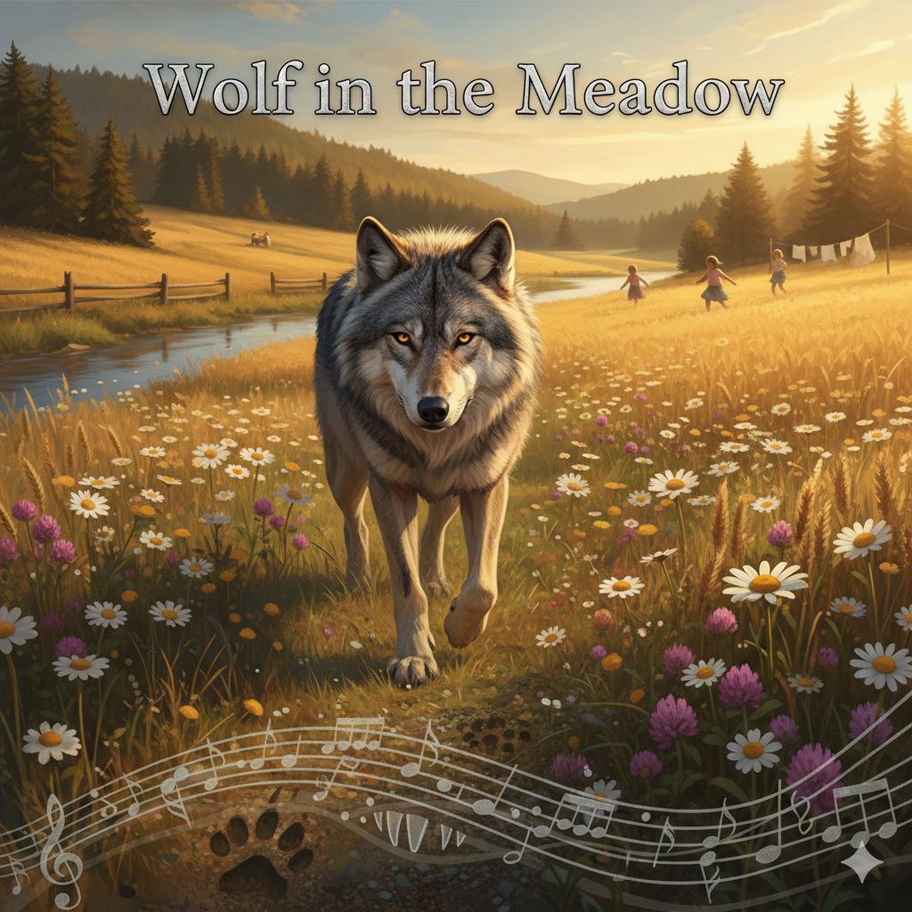 Intro with soft ambient meadow sounds and gentle acoustic guitar fingerpicking, Acoustic Folk / Pastoral Pop, Warm, intimate female and male duet harmonies, Storytelling lyrics about peace and hidden danger coexisting in nature, Organic instrumentation: acoustic guitar, light mandolin, subtle piano, brushed percussion, soft strings swelling in chorus, Gradual build from delicate verses to emotionally rich, layered chorus, Natural reverb, airy production, cinematic but earthy, Calm yet slightly haunting mood, reflective, tender, pastoral atmosphere