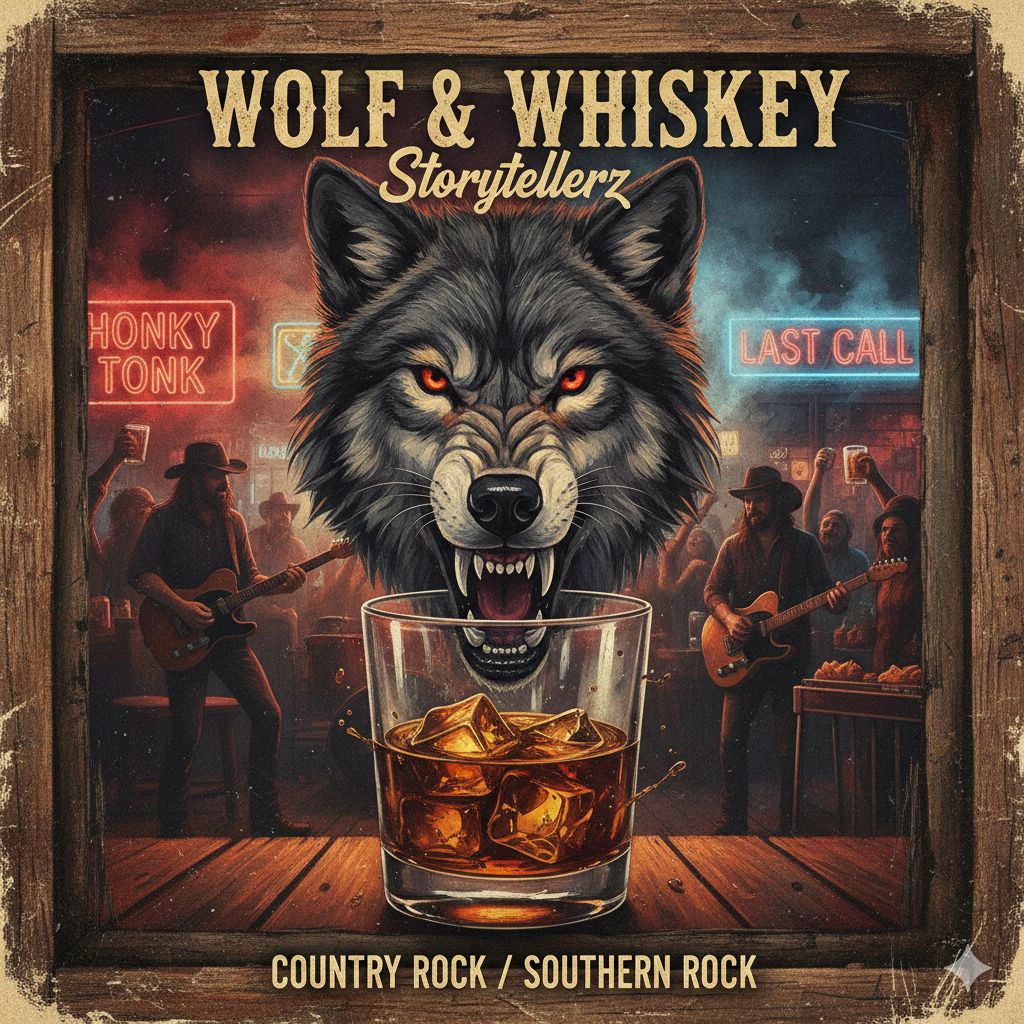 Country Rock / Southern Rock barroom anthem, Gritty male vocals with Southern drawl, Electric Telecaster twang, crunchy rhythm guitars, and slide licks, Driving drums with a stompin’ kick and snare, Thick bass groove that walks and growls, Backing gang vocals in the chorus shouting “Wolf and Whiskey!”