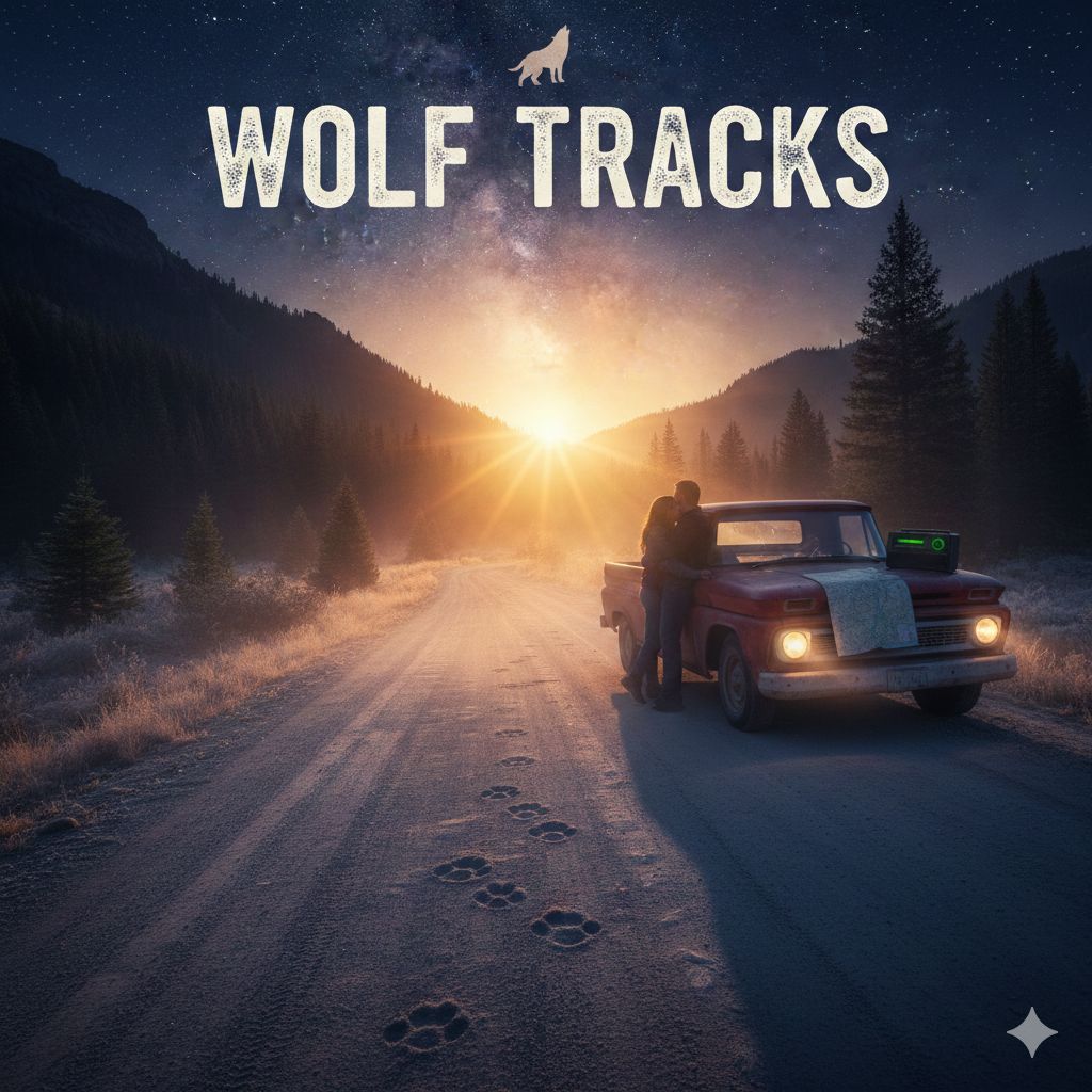 Americana / Country Pop, feel-good car ride anthem with modern Nashville polish, Warm acoustic guitars, steady kick and snare, subtle banjo or mandolin textures, airy electric guitar swells, Mid-tempo, driving but relaxed groove, Male or female lead vocal with heartfelt, natural delivery; intimate verses, soaring emotional chorus, Lyrics about travel, freedom, love, and instinct, using wolf tracks as a metaphor, Bright, hopeful mood with cinematic open-road energy, Clean production, radio-ready, uplifting and nostalgic