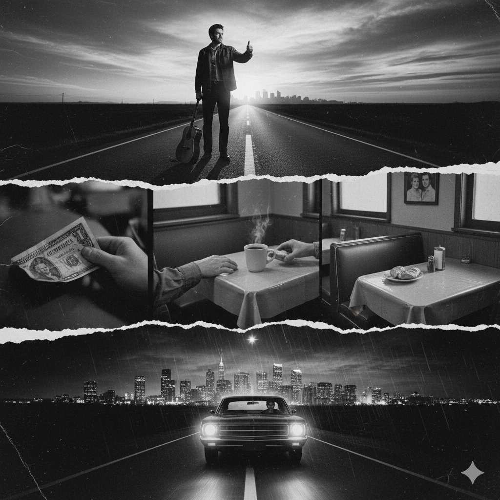 At 140 BPM, this cowpunk western rock track kicks off with a biting Telecaster hook and snapping fingerstyle bass, driving forward with galloping minimalist drums and crisp handclaps, Verses stay sparseβcutting guitars, pulsing bassβwhile choruses explode with twangy leads, haunting whistles, lush harmonies, deep 50s-male backing vocals, and cinematic folk-country textures, all shot through with punkrock clash-style energy