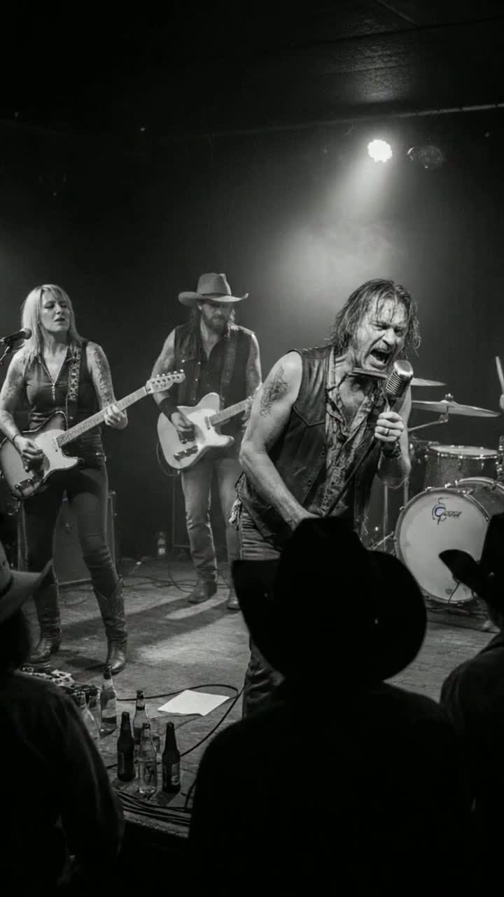 High-energy Country-Rock-Cowpunk at 145 BPM, intro features rowdy crowd chanting over stomping kick and snare, bleeding into a brief spoken exchange between Singer A and Singer B, Alternating gritty, raspy verses trade licks over distorted blues-rock riffs, Anthemic group harmonies explode in the chorus, A wild, feedback-laden guitar solo barrels through the bridge before both singers unite for a powerhouse endingβbig gang vocals, pounding drums, and layered, hard rock guitars bring a dark-country-tinged finish