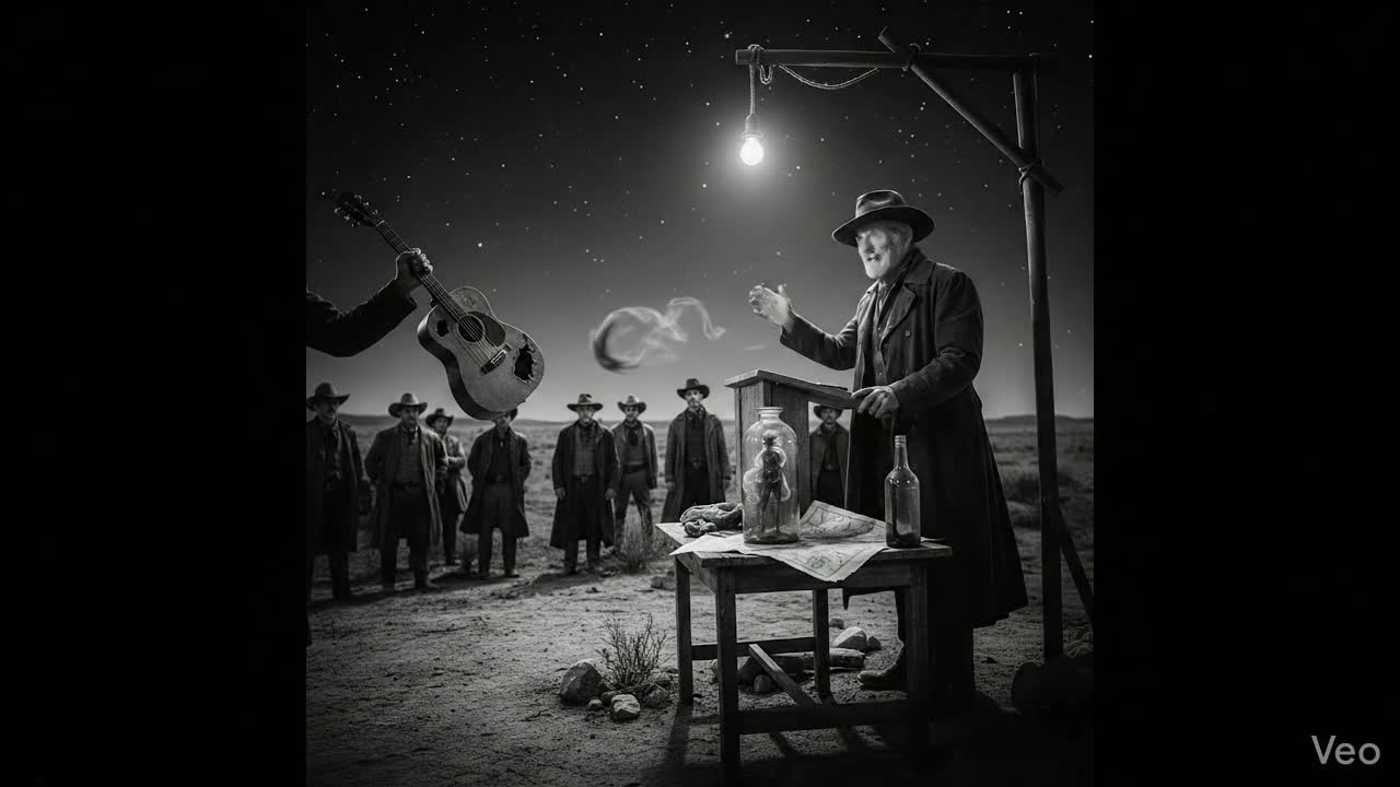 Dark, heavy Outlaw-Country with a primal tribal pulse, 135 BPM, The foundation is a continuous, vibrating low-pitched didgeridoo drone intertwined with a fast, percussive "boom-chicka" slap-bass, Shamanic frame drums provide the heavy downbeat, while a crisp, galloping country snare drives the tempo, Distorted, swampy baritone guitar riffs and a haunting, minor-key harmonica weave through the thick "wall of sound, " Raw, gravelly vocals with a ritualistic echo, Primal, driving, and Western
