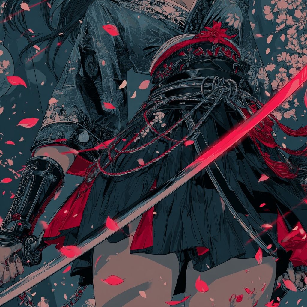 Energetic Japanese rock × symphonic fusion instrumental, inspired by Senbonzakura, Fast tempo (BPM 170), minor key, Driving rock drums with snare accents, layered with Japanese taiko and percussion, Distorted electric guitar riffs lead the melody, supported by string orchestra stabs and cinematic brass, Japanese instruments (shamisen, shakuhachi, koto) weave in ornamentation, Structure: powerful taiko + shamisen intro, then fast guitar + strings unison theme, transitioning to grand brass + strings chorus, Middle bridge: shakuhachi solo over low strings, Finale: full band tutti, explosive rock × orchestra climax, ending with dramatic taiko hit + guitar chord, Mood: intense, heroic, dramatic, traditional × modern fusion