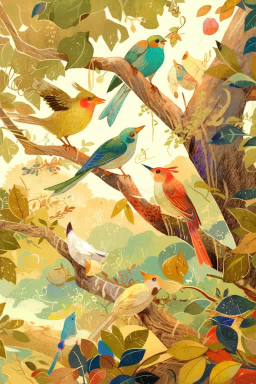 Fairy-tale Forest Morning × High-Pitched Wind Instruments, BPM 108, Key F major, Main melody on Piccolo and Flute with playful chirps and lyrical lines, Tin Whistle adds soft echoing calls, Throughout the piece, sudden high-pitched trills and short staccato bursts (chirp-chirp, tweet) appear like random birds calling in the forest, Some are single sharp trills, others are quick chirping ornaments, Atmosphere: whimsical, bright, immersive, like birds occasionally bursting into song above a gentle morning ensemble