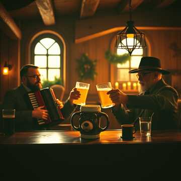 Accordion-driven, Bavarian Gstanzl, Folk, Accordion Solo, Tavern Atmosphere, Clinking Glasses, Jolly, Rustic, Male Vocals, Traditional Upper German Dialect, Mid-tempo, 3/4 Waltz rhythm, Southern German Accent