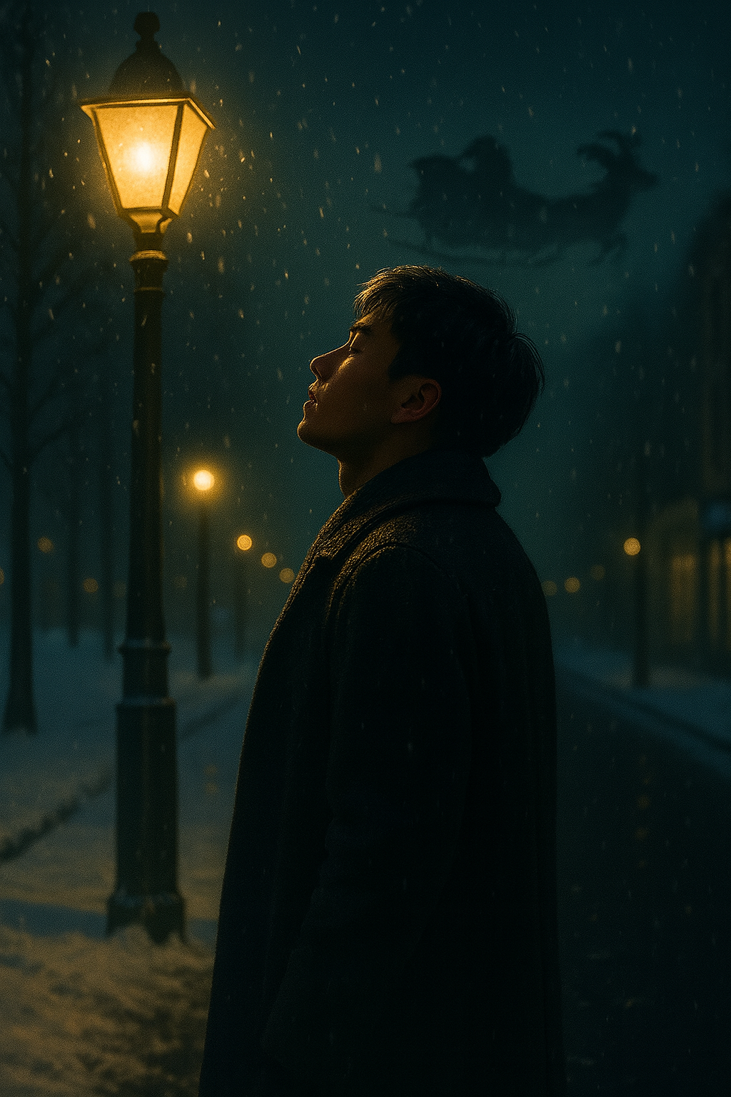 A chill and emotional Japanese alternative rock song with a light, melodic drive and nostalgic warmth, set on a snowy Christmas night, Two electric guitars define the sound — one playing bright arpeggios with soft reverb, the other strumming gentle overdriven power chords for a dry, emotional tone, Bass and drums create a steady groove with subtle motion, keeping the rhythm alive but never heavy, Male vocals are youthful and clean, tender in the verses and emotional in the choruses, singing with honest energy and a touch of rawness, The atmosphere blends ambient softness and winter brightness, like walking through a quiet town on Christmas Eve, where snow falls under glowing lights, The song builds gently toward an emotional finale, then fades with lingering guitars and reverb, leaving a bittersweet afterglow like snow melting in the morning sun