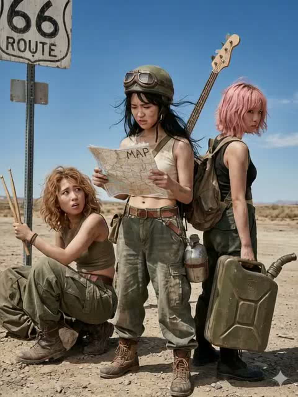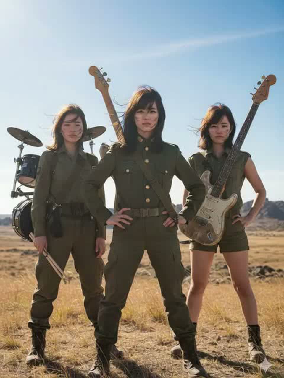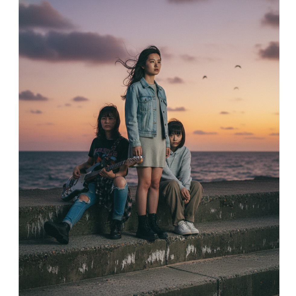 Lo-fi girls punk rock with a dusty country-rock edge and emotional J-rock drive, 172 BPM, raw and uplifting mood, Gritty overdriven rhythm guitars with loose downstroke energy, twangy lead licks and subtle slide accents, punchy melodic bass, fast but slightly imperfect live drums with natural room bleed, Female vocals are strong and straightforward, slightly raspy but not screamed, carrying determination and warmth, Gang shouts in choruses, Simple anthemic melodies, open-road atmosphere, DIY garage production, tape saturation, minimal polish, no synths, no trap beats, no glossy pop finish, Energetic, hopeful, rebellious, ‑shout, ‑death voicee